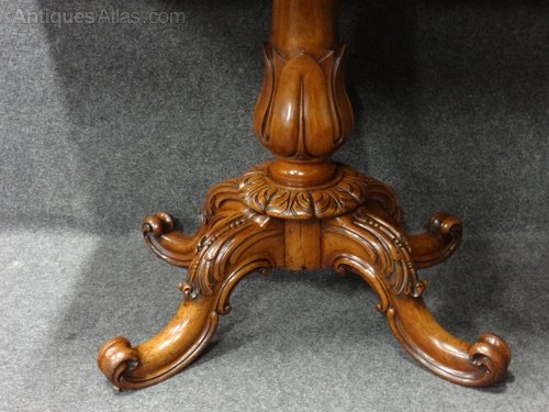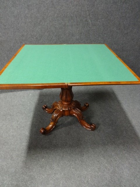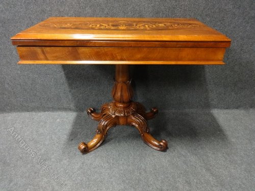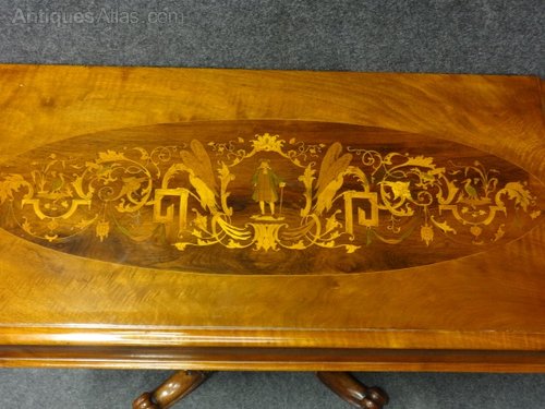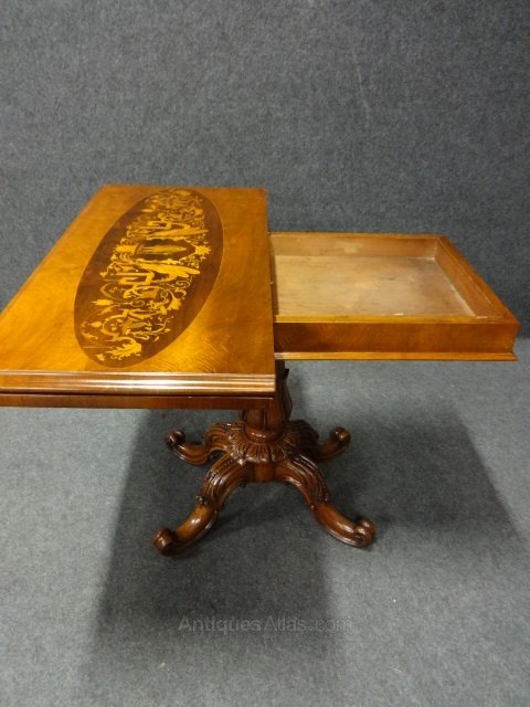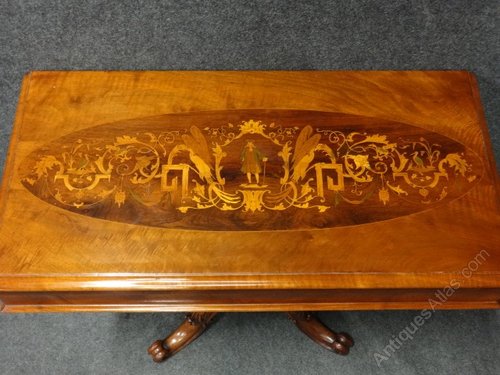 A stunning walnut card table with acanthas leaf base on scroll legs, the top is profusely inlaid with mythical animals and figure, opens to reveal replaced baize.