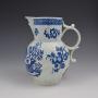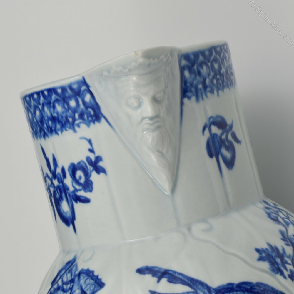 Reference Worcester Blue & White Porcelain, Branyon, French & Sandon, section II.B.23. This pattern in the main is not uncommon but is rarely found on the large mask jugs and additionally with the cell border.