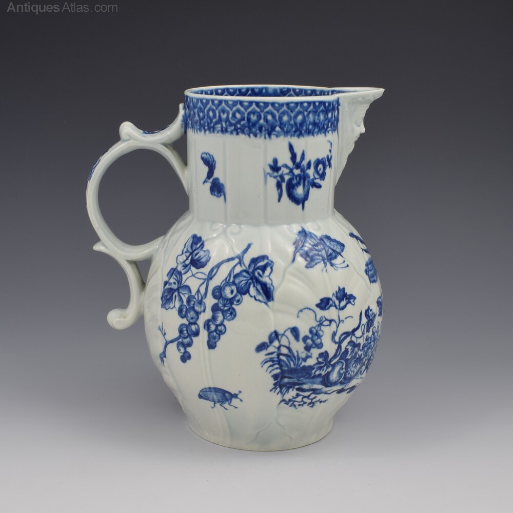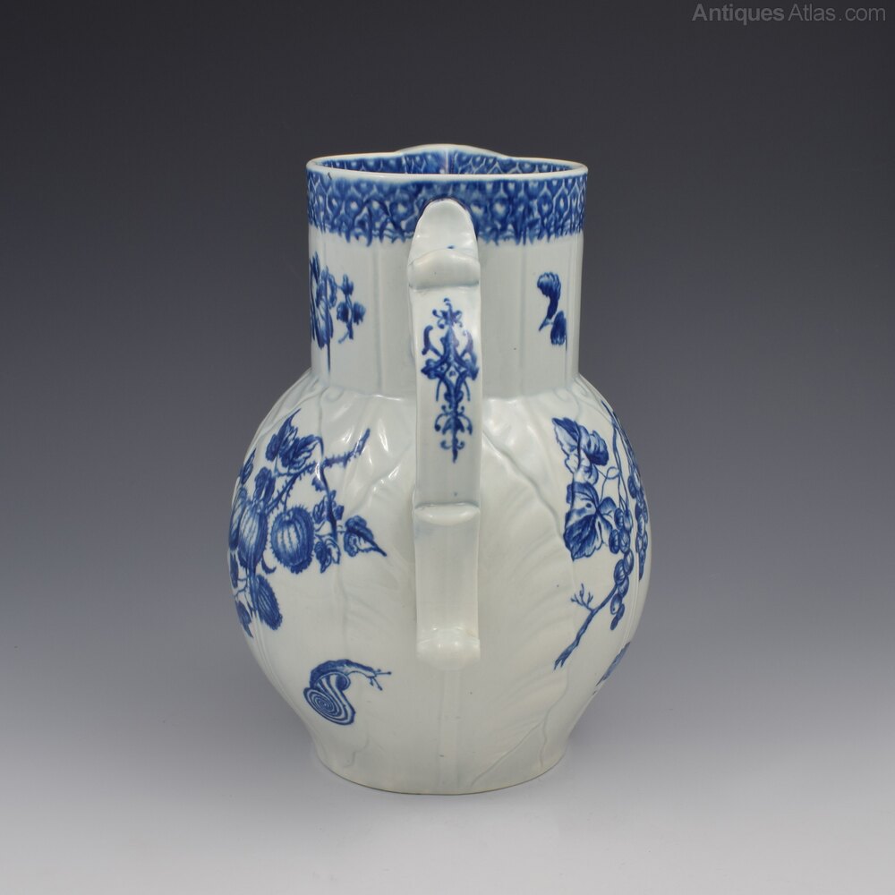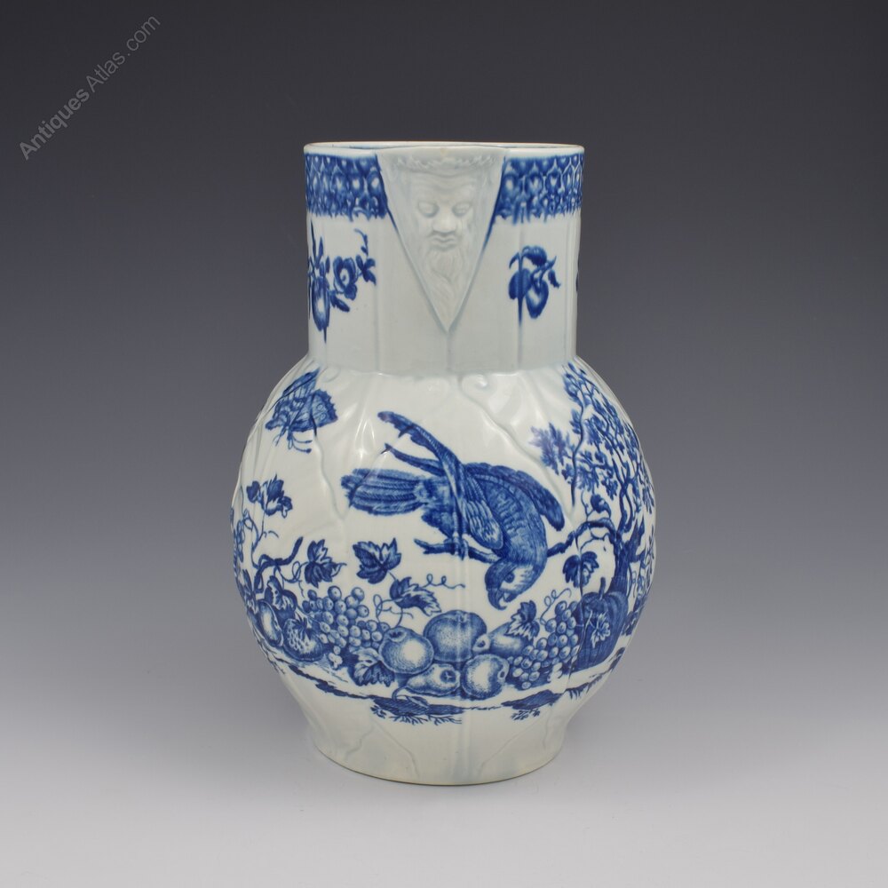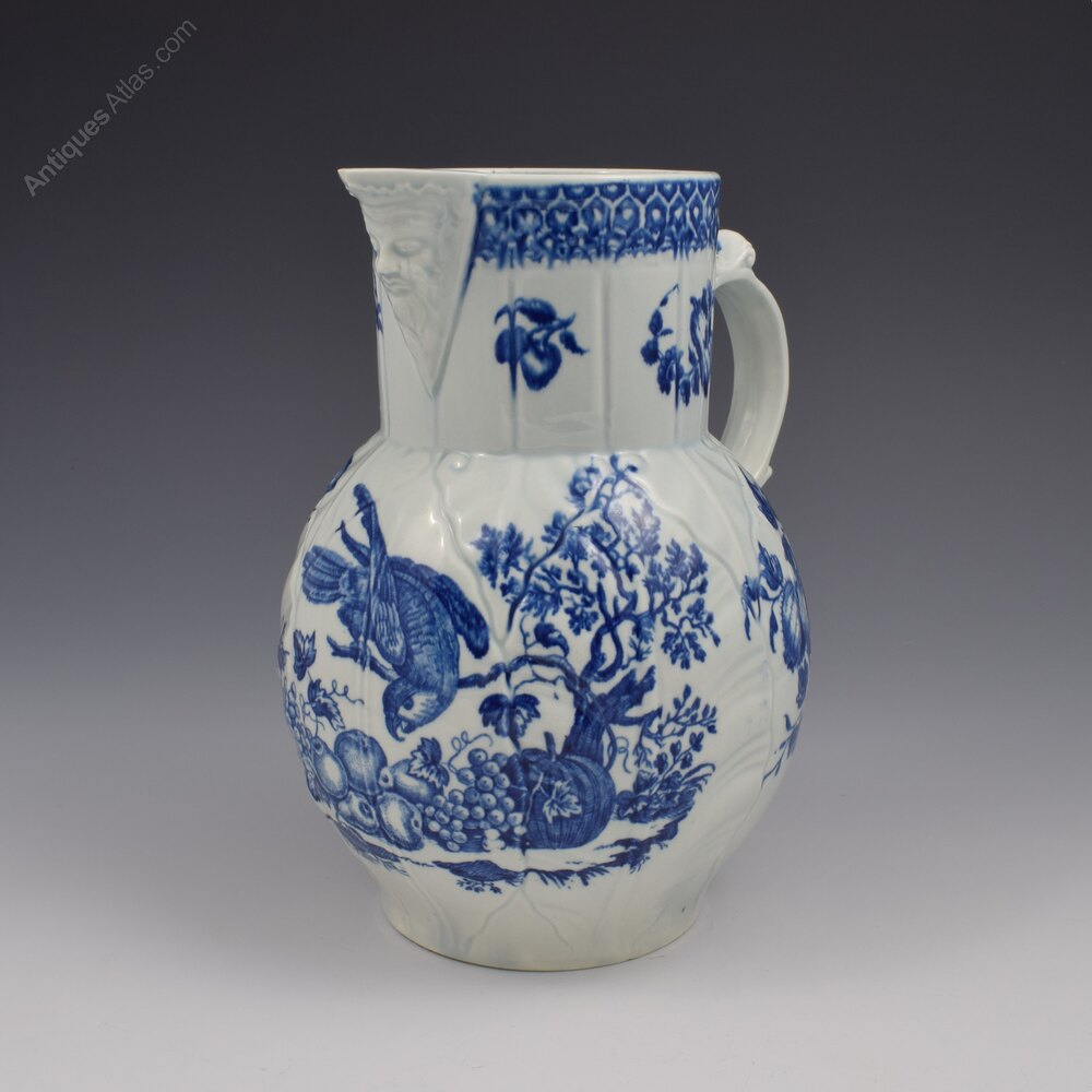 Superb Worcester porcelain mask jug with cabbage leaf moulding to the body and vertical fluting to the neck. Printed with the Parrot Pecking Fruit pattern, c.1775, with a interlocking cell border inside and outside the rim. Aside from the main central image of the parrot surrounded by harvested fruit and vegetables, are a suite of subsidiary prints, only found on the larger items in this pattern, including a bunch of gooseberries, a spray of currants, a trundling beetle and an oddly shaped upside down snail. Other smaller sprigs and two larger arrangements around an apple and a squash are dotted around the neck and a rather incongruous neoclassical type pattern down the back of the handle. Unmarked.