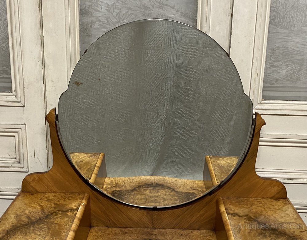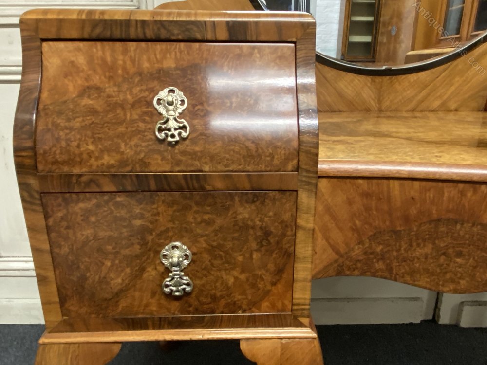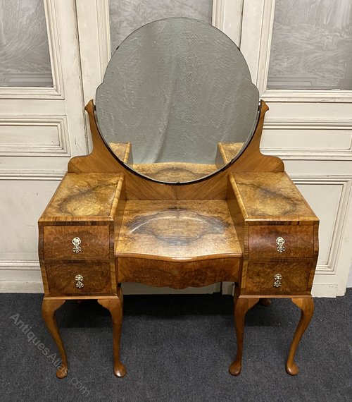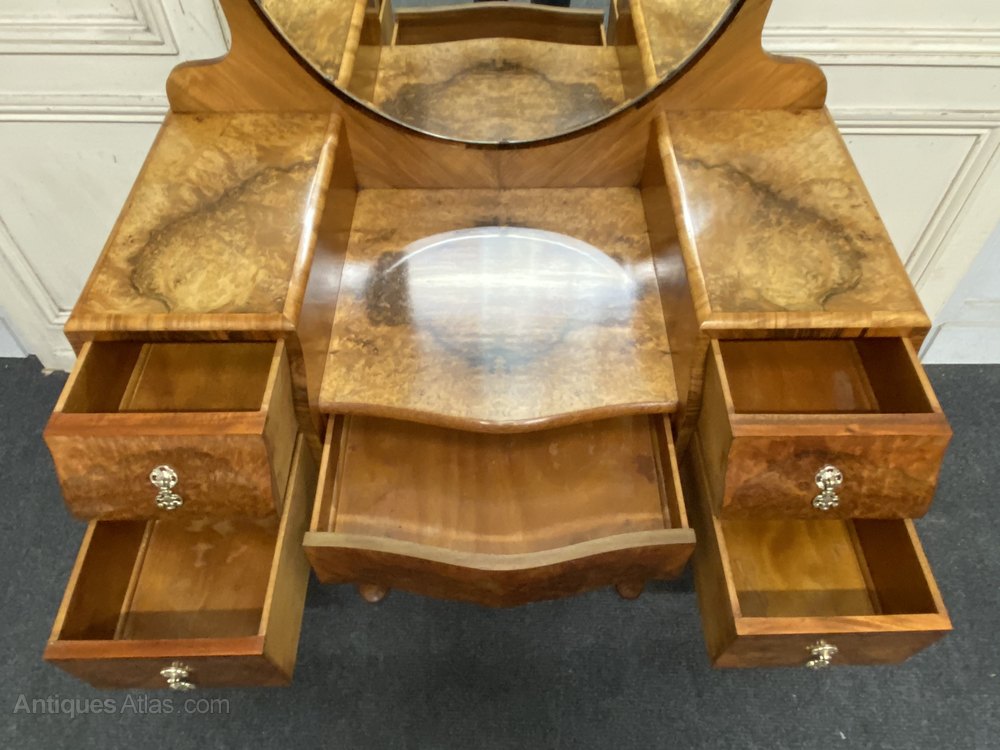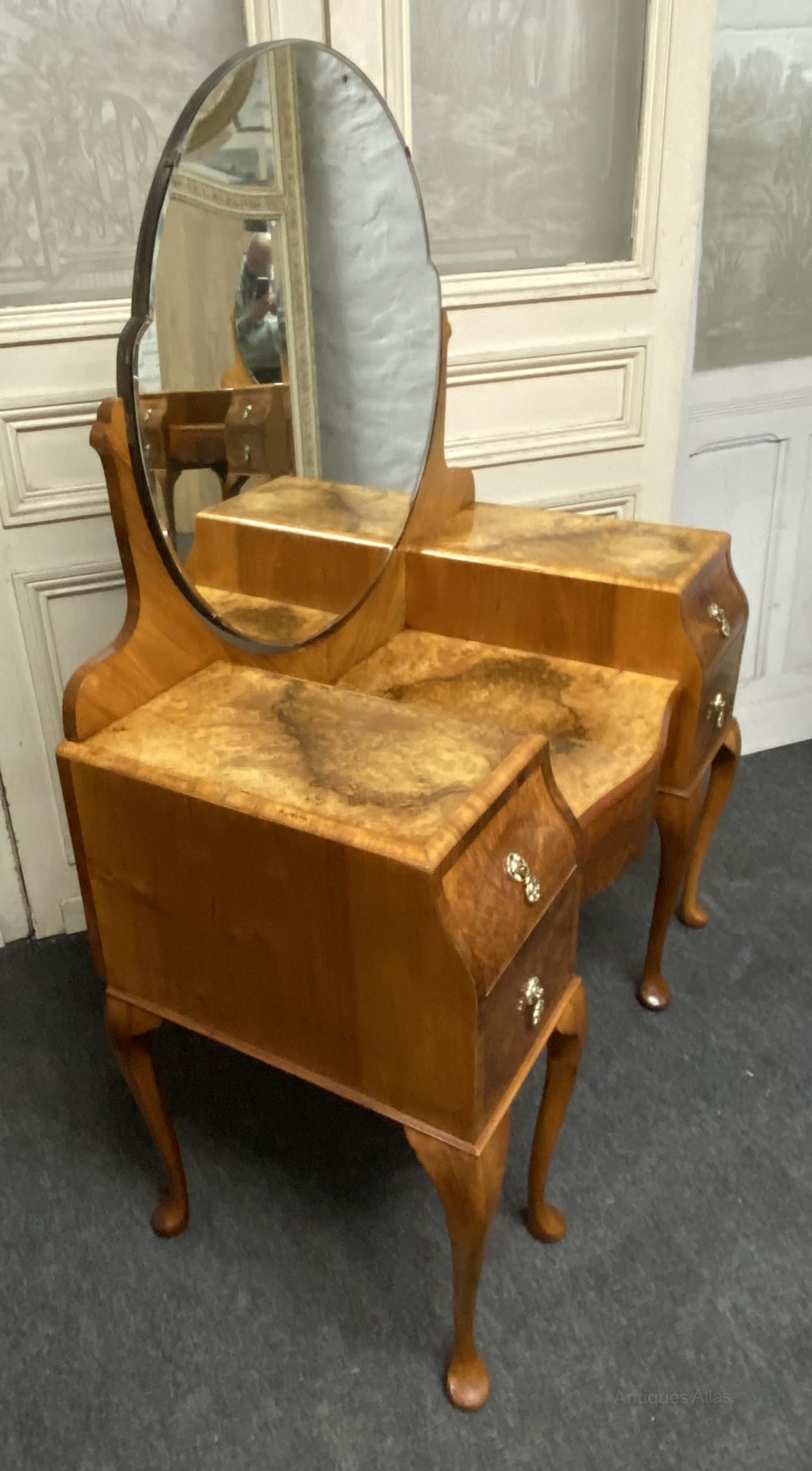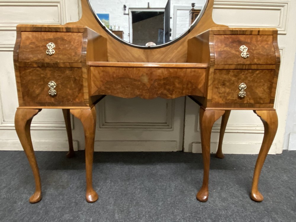 We love this stylish and different Dressing Table, made in the 1920’s from Walnut with excellent Burr Walnut to the top surface and front. This is a very high piece, lots of extra features that would have been expensive to manufacture at the time. The mirror moves back and forth and the drawers run smoothly fitted with original handles.