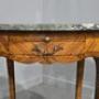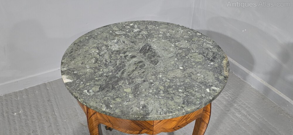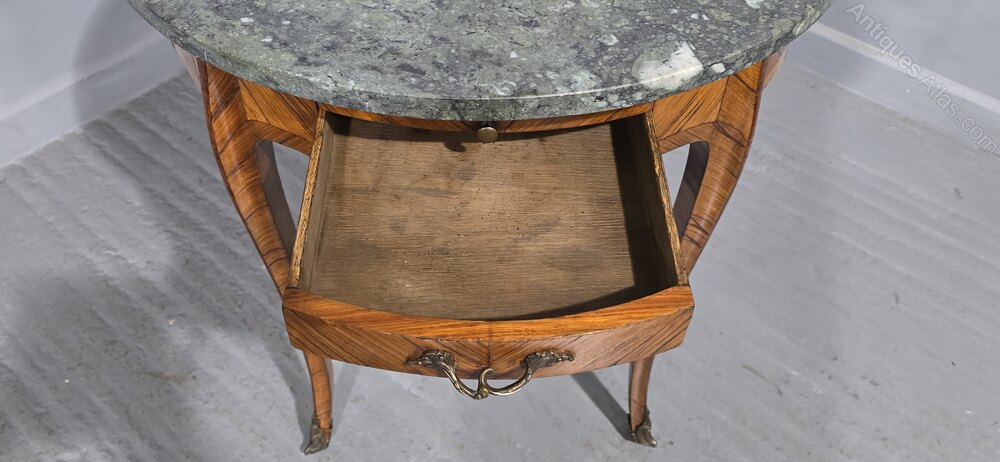 Very nice French Gueridon table, with drawer and red leather slide, tulipwood with banding, very pretty and rare ormolu cup castors, green varigated marble top, in overall excellent original condition.