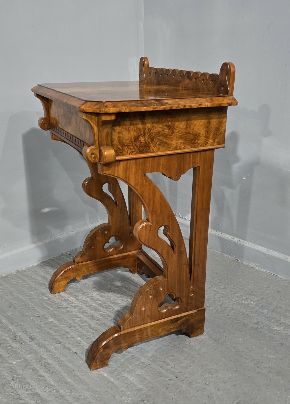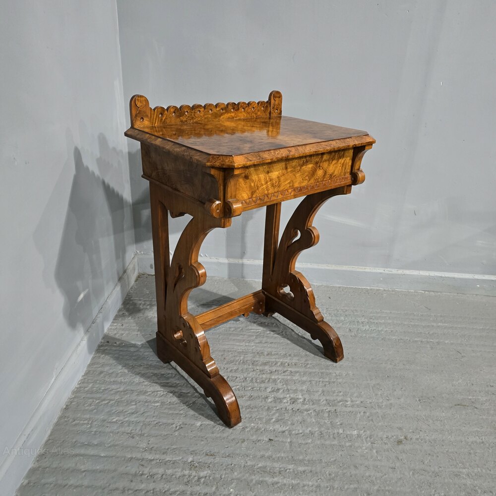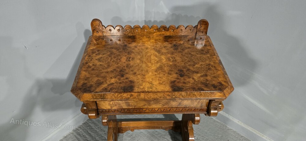 Top quality Victorian Gothic Revival hall table in burr walnut, having a carved gallery to the back, with central drawers in excellent overall condition.