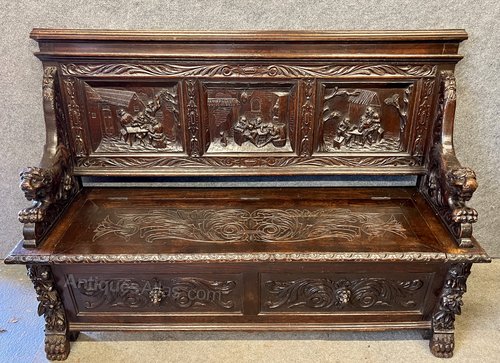 A superb well carved 19th Century English oak hall seat. The high back having three carved panels depicting indoor and out door tavern scenes. The armrests with carved recumbent lions with Green Man carving above, the hinged seat lifts to reveal a useful storage space for shoes or boots etc. The front of the settle having two carved panels incorporating lion mask heads and the whole raised on lion’s paw front feet. Condition- Very good. Dimensions:- Height… 41''/ 104cm. Width… 62''/ 157cm. Depth… 22''/ 56cm. Seat Height…17.5''/ 44.5cm. Delivery to most of U.K. mainland £65.