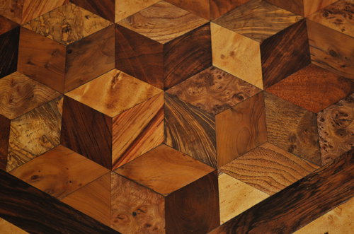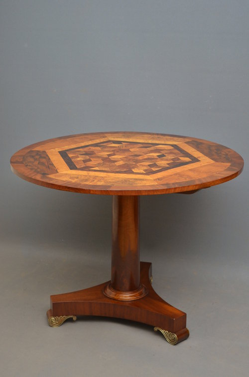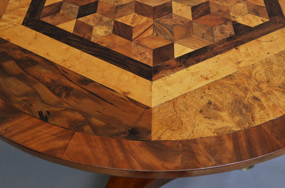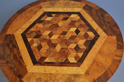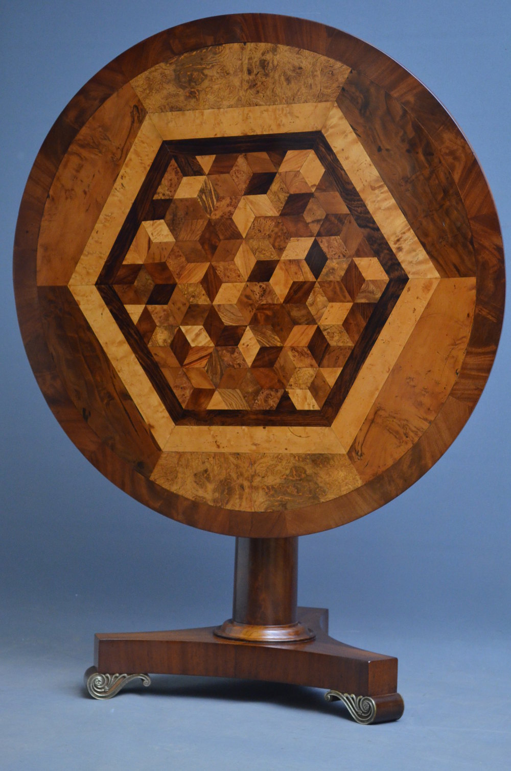 Sn3041 Exceptional early XIX century specimen table, having exotic multi wood (ebony, yew, bird's eye maple....) cube parquetry inlaid top with flamed mahogany banding to edge, raised on turned column terminating in triform base and brass scrolled feet. c1830