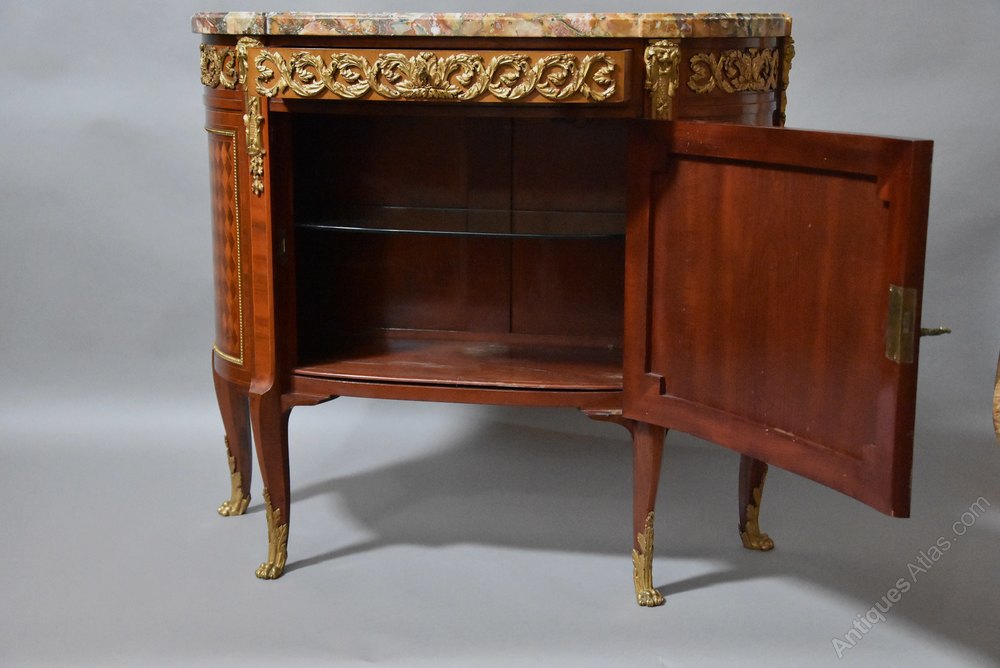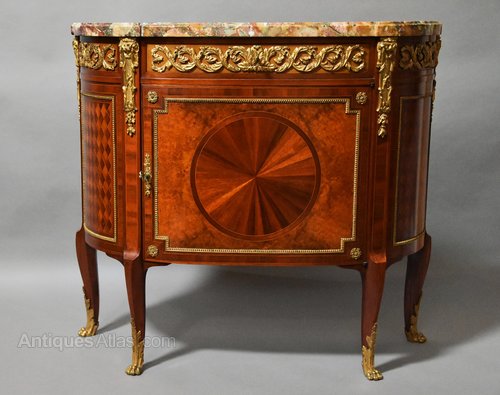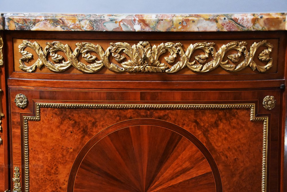The sides are shaped to form the bow shape of the piece, each side having identical elaborate ormolu frieze to the top leading down to a Kingwood and boxwood stringing with ormolu moulding. Within this moulding is a parquetry (geometric inlaid design) panel of Kingwood, boxwood and ebony.