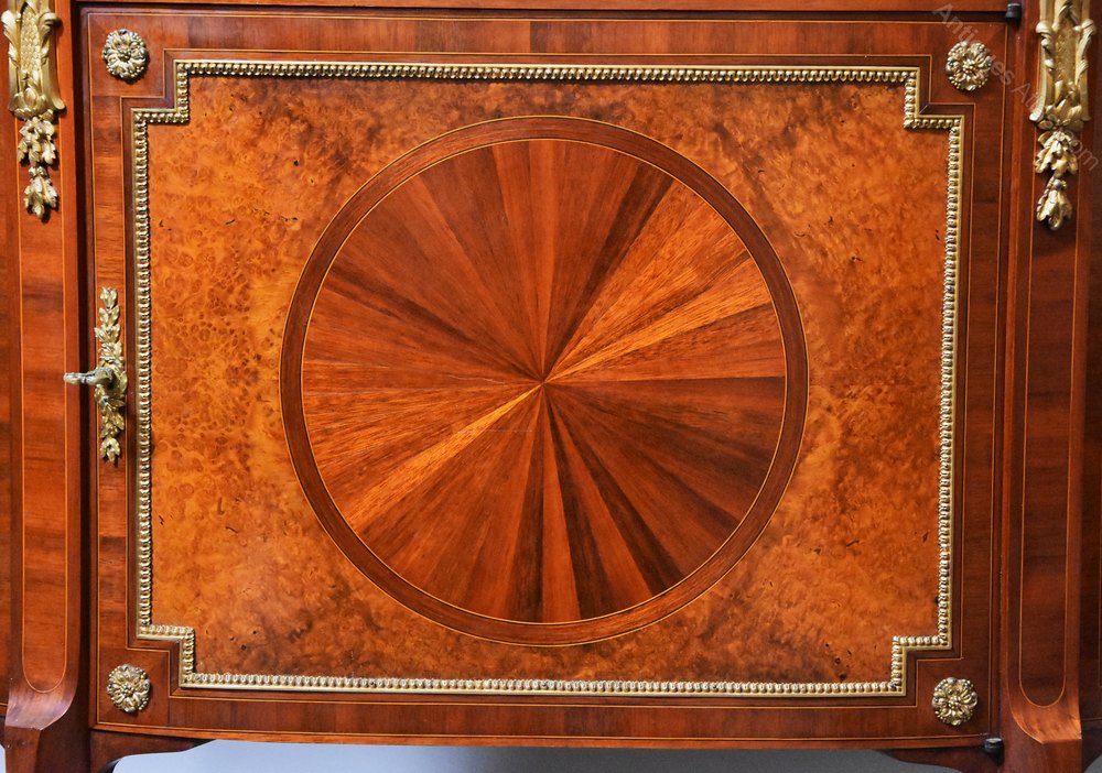 The door consists of four circular floral ormolu paterae to each outer corner with boxwood & ebony stringing, Kingwood cross banding, boxwood & ebony stringing and ormolu moulding. Within the moulding is a panel of thuya wood with a central circular outer inlay of boxwood & ebony stringing, Kingwood circular banding with an inner central segmented inlaid design of Kingwood