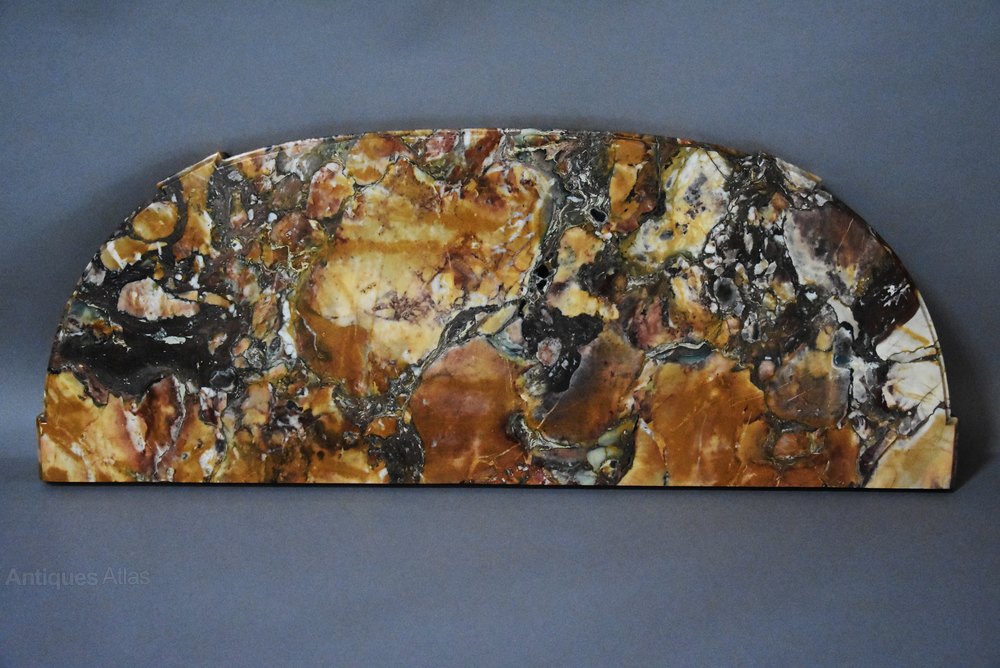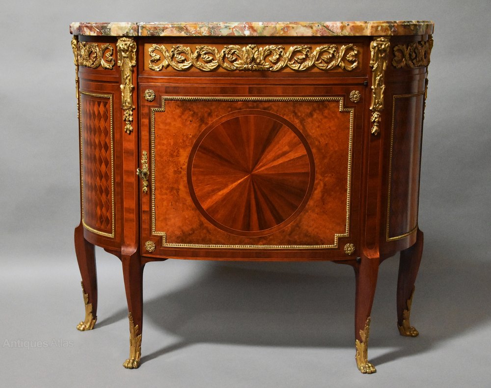 This commode consists of a richly coloured, finely figured shaped marble top (most probably Breche de Vendome) of bow form with a moulded edge in very good condition. The Breche de Vendome marble is a blend of yellow, cream, violet and green colours, it is sourced in the Pyrenees region of France and has been quarried since the 18th century until the present day, it was particularly popular in the early 20th century, often used for the tops of antique tables, chests and cabinets etc.