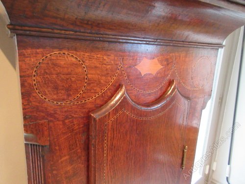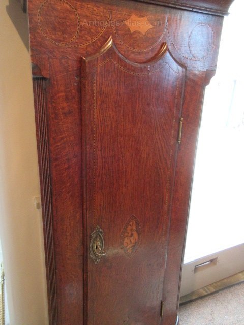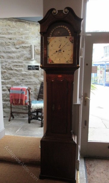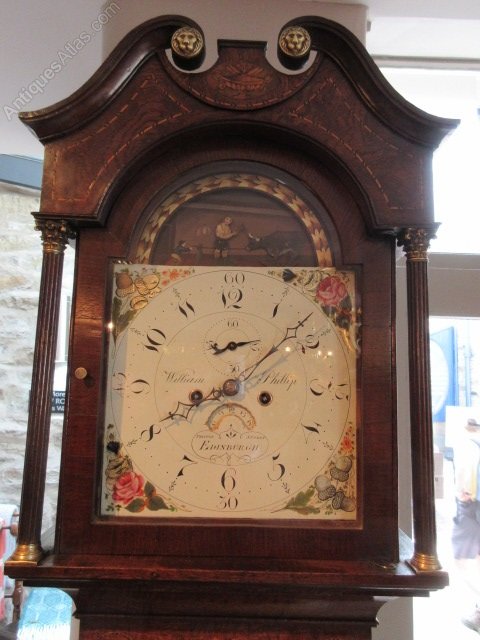 A Superb George III period Sheraton inlaid 8 Day longcase clock.c.1780. Painted dial with automation to the arched top. Strikes on a bell to the hour. Made by William Phillip of Edinburgh. Shell fruitwood inlays to the polished oak case. Full working order. Stands 82"high. Stock no.31114.