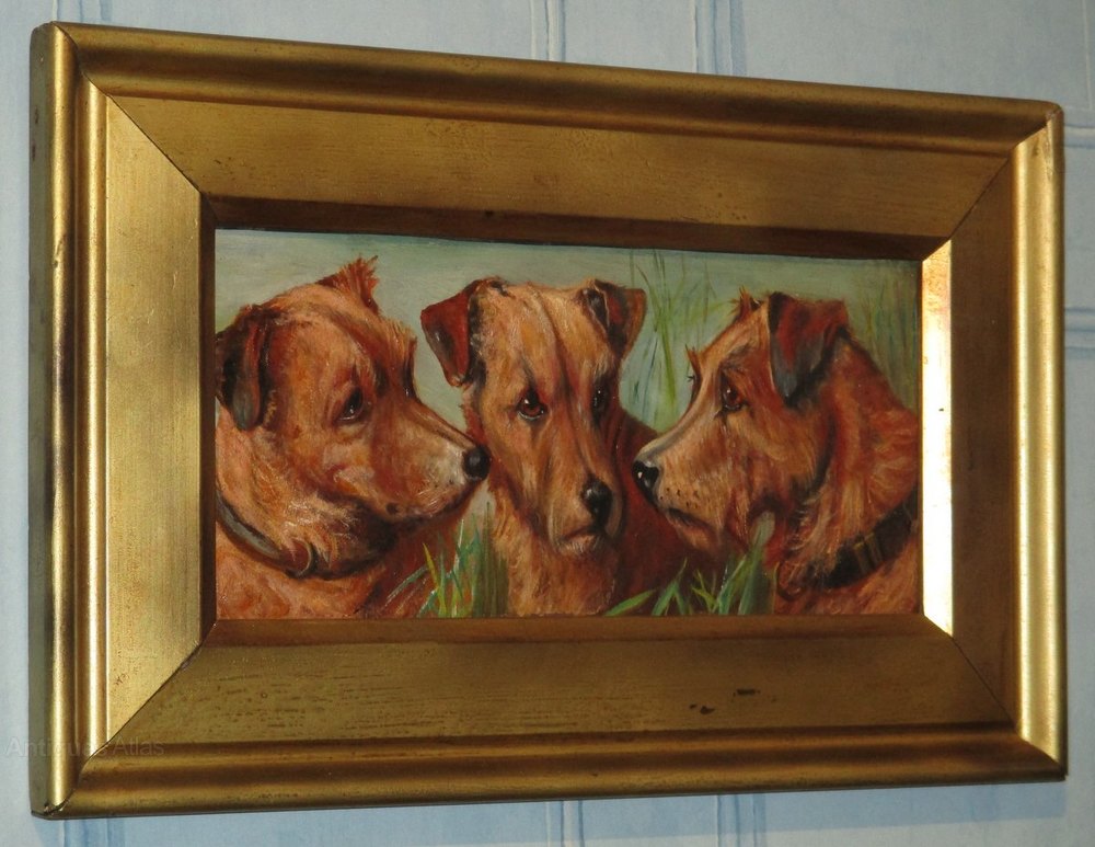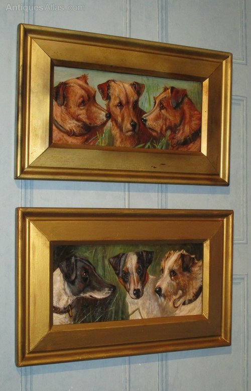 A wonderful and hugely charming pair of oil paintings of terrier dogs. The paintings are in oil on artists board and are of a very high standard, yet sadly not signed. The pair are mounted in the original frames, one of which has been regilt to match the other one as closely as possible but obviously there is a slight difference to be aware of. The pair have the original frame makers label on the reverse and appear to be London made. The pair have been cleaned but other than that remain in untouched and excellent condition. C.1920.