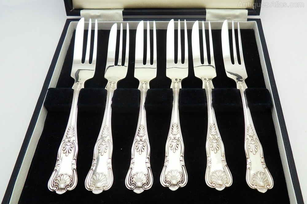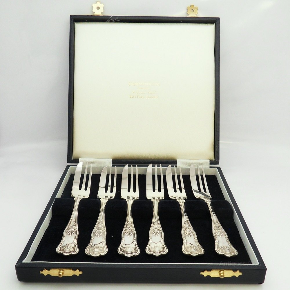 A very fine boxed set of gorgeous King's Pattern solid silver Cake Forks. The forks are in super condition and all are fully hallmarked on the back of each handle for Sheffield 1979, along with the Lion Passant indicating the finest sterling silver and the silver maker's mark: Francis Howard.