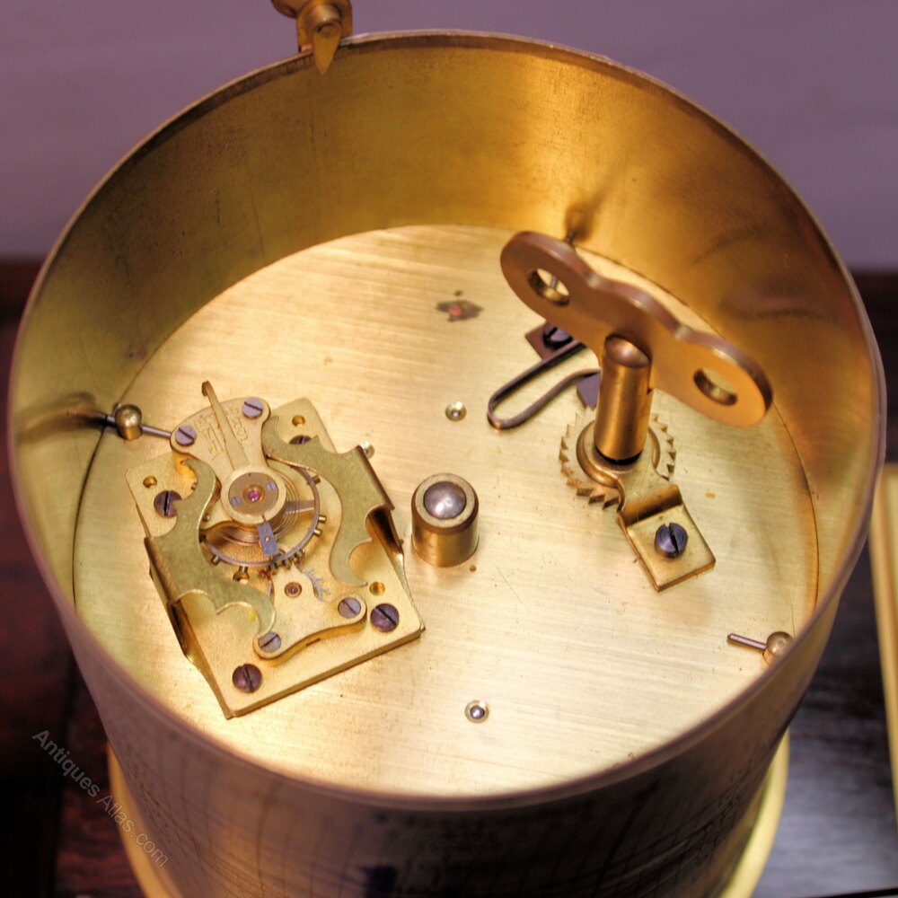 The gilded chart drum and cover contains the 8 day duration clock movement with its original jewelled, straight line, club toothed, lever platform escapement beating 18,000 times per hour and visible once the protective cover is removed for winding. It also retains its protective 'horns'.