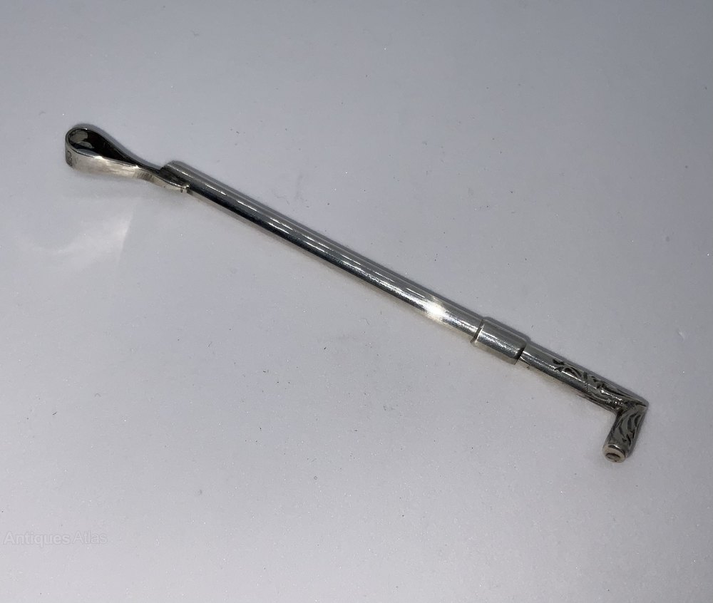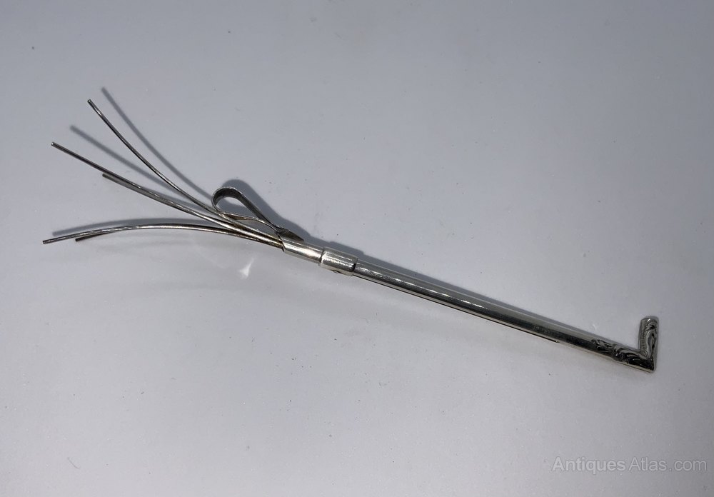 A novelty silver swizzle stick in the form of a riding crop.