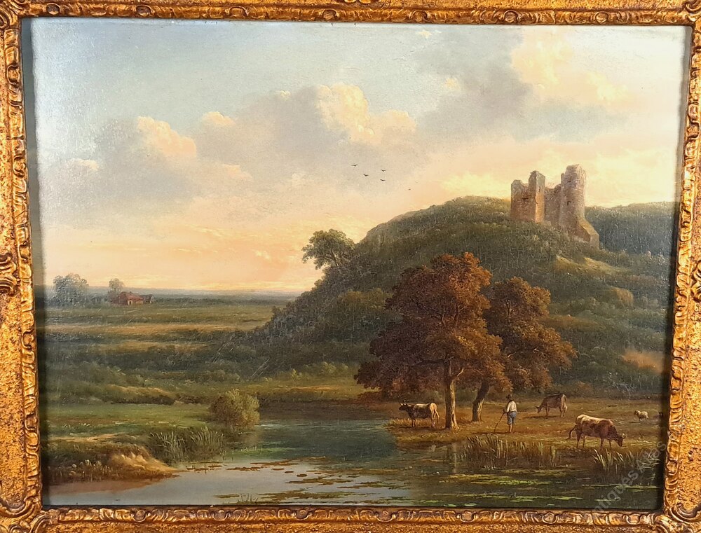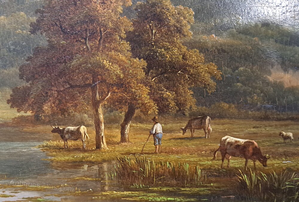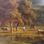 The painting is exceptionally well executed and in superb original condition. It depicts a bucolic landscape of cows and sheep grazing at the edge of a lake below a hill with castle ruins, possibly near to Bolton Priory but I would love to know a firm location if you recognise it. The farmer rests on his staff whilst his trusty dog rests in the background.