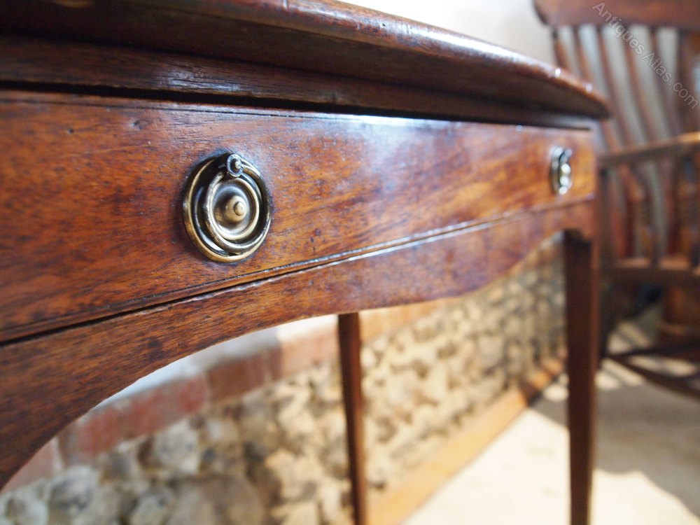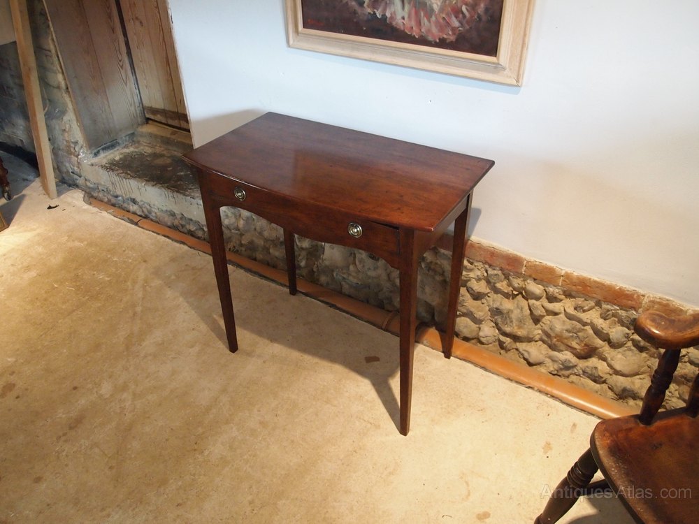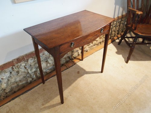 Here we have a fine quality George III Mahogany side, lamp, hall or console table c1790. As you can see the table has excellent colour and patina. There is a stunning single peice of Cuban Mahogany to the top with super colour and grain with a gentle bow front. There is a single drawer with original handles, hand cut dovetail joints and Oak linings. This Sheraton period table has squared and tapered legs giving a very elegany look. A super perod table in great retail condition ready for your home. The dimensions are approx 29 .5 inches wide, 28 high and 17 deep.