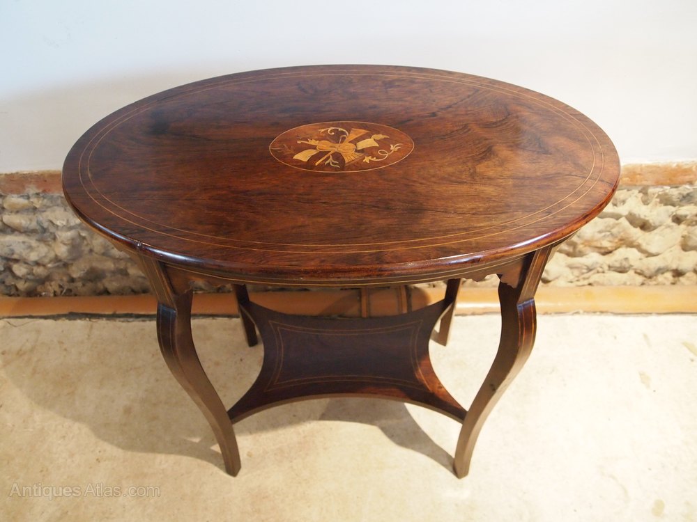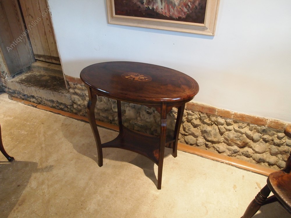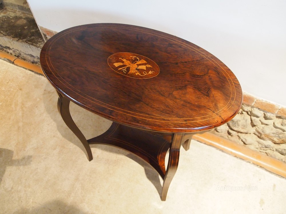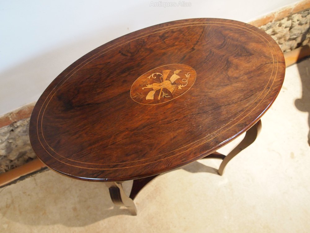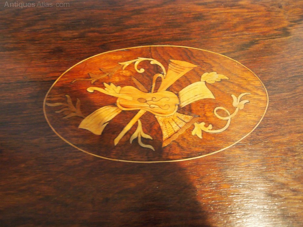 Here we have a wonderful Victorian Rosewood and inlaid side hall or lamp table c1880. As you can see the table has exceptional colour and patina. The top has super grain and colour with a double Box string. There is also a central cartouche with inlaid Walnut, Satinwood and Box in the form of a Cello trumpet and foliage. There is a frieze below the top with blind fret decoration. There are Cabriole legs and an underteir which along with the frieze have Box wood string decoration. A fine table in excellent retail condition ready for your home. The dimensions are approx 29 inches wide 17 deep and 27 high.