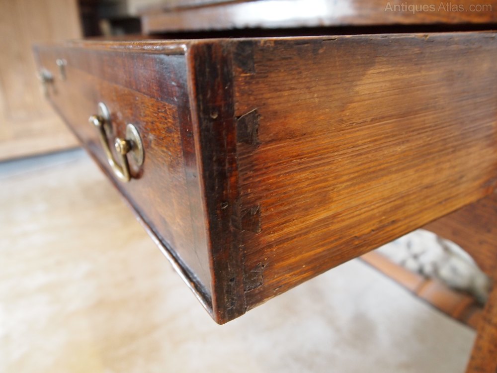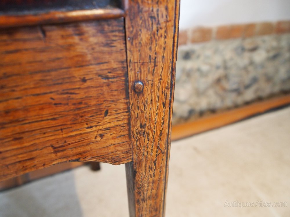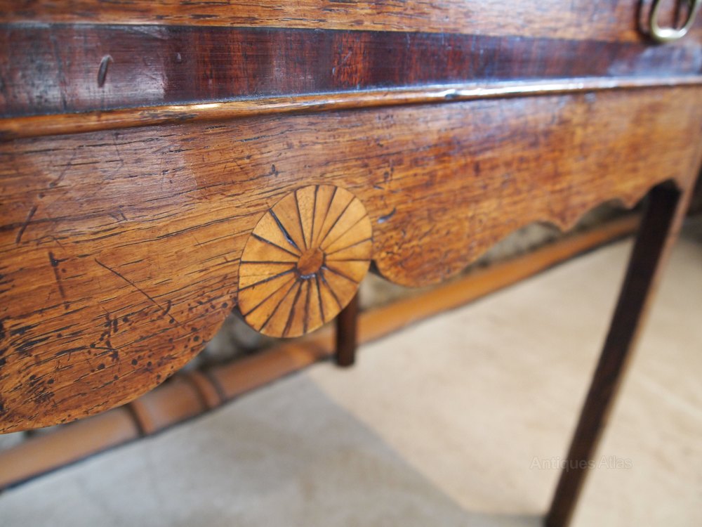 Here we have a stunning Sheraton period George III Oak table or lowboy c1780. As you can see the table has great colour and patina. There is a two plank top with moulded and crossbanded edge. Below there is a single long drawer with cross banding and cockbeaded edge. The drawer has dovetail construction and retains the original brass swan neck handles. There is a beautiful shaped frieze and inlaid patera roundel to the front centre. The legs have a moulded edge and internal chamfer. The whole is of pegged mortice and tenon construction throughout. A super table of exceptional colour and patina in great retail condition ready for your home. The dimensions are approx 34 inches wide 19 deep and 27.5 high.