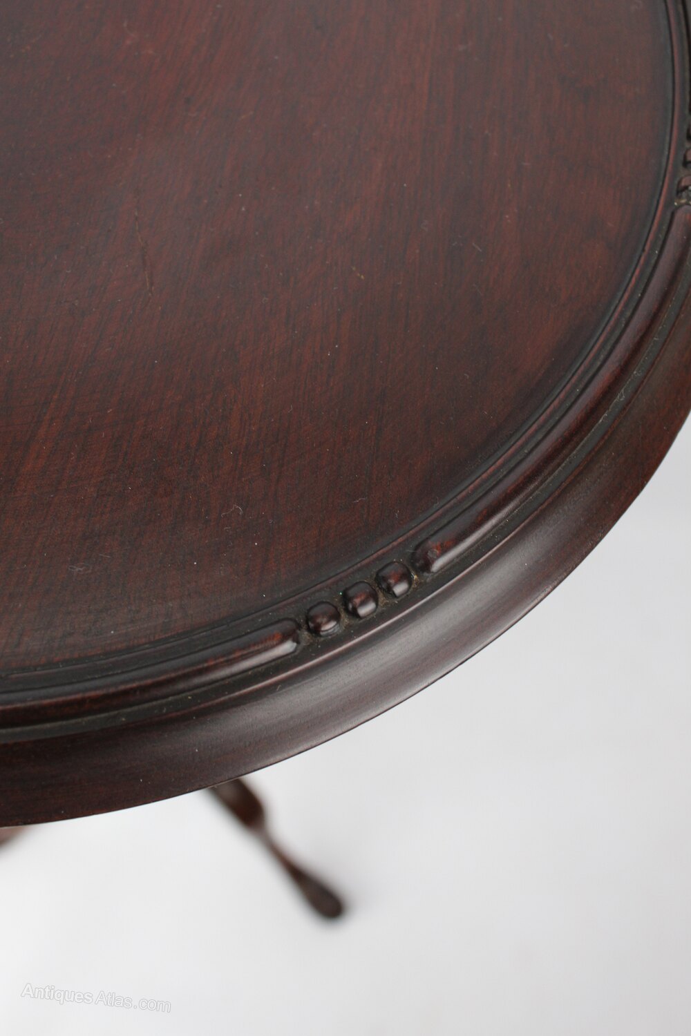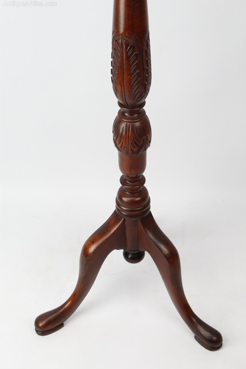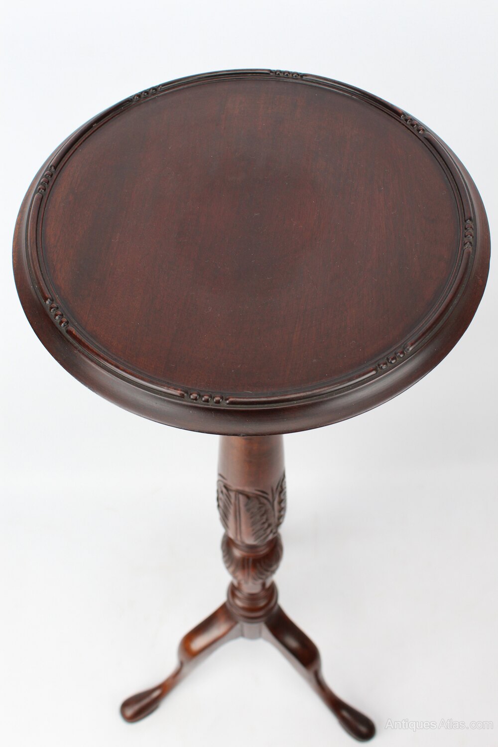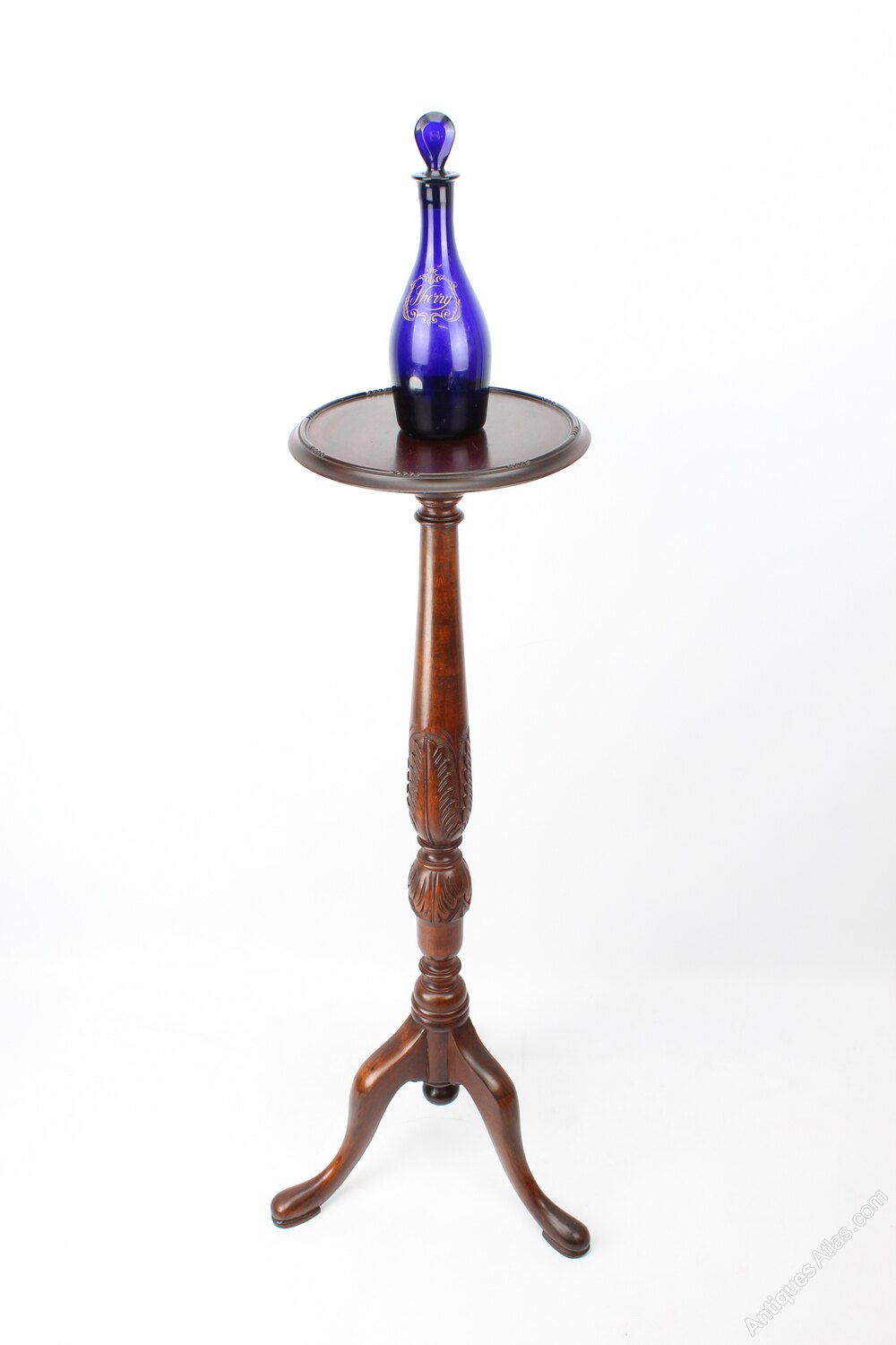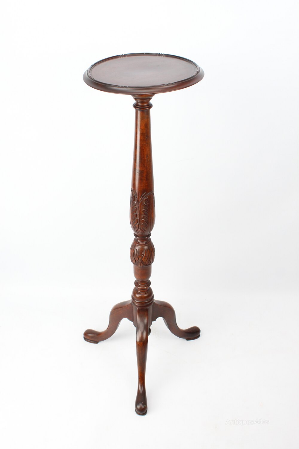 A handsome and tall antique Edwardian carved mahogany plant stand or torchère in Georgian revival design and dating from circa 1905. Featuring a circular dish top with egg and dart beading and standing on a beautifully acanthus carved and turned column with tripod base terminating on pad feet. A quality example in good condition with good colour and patina.