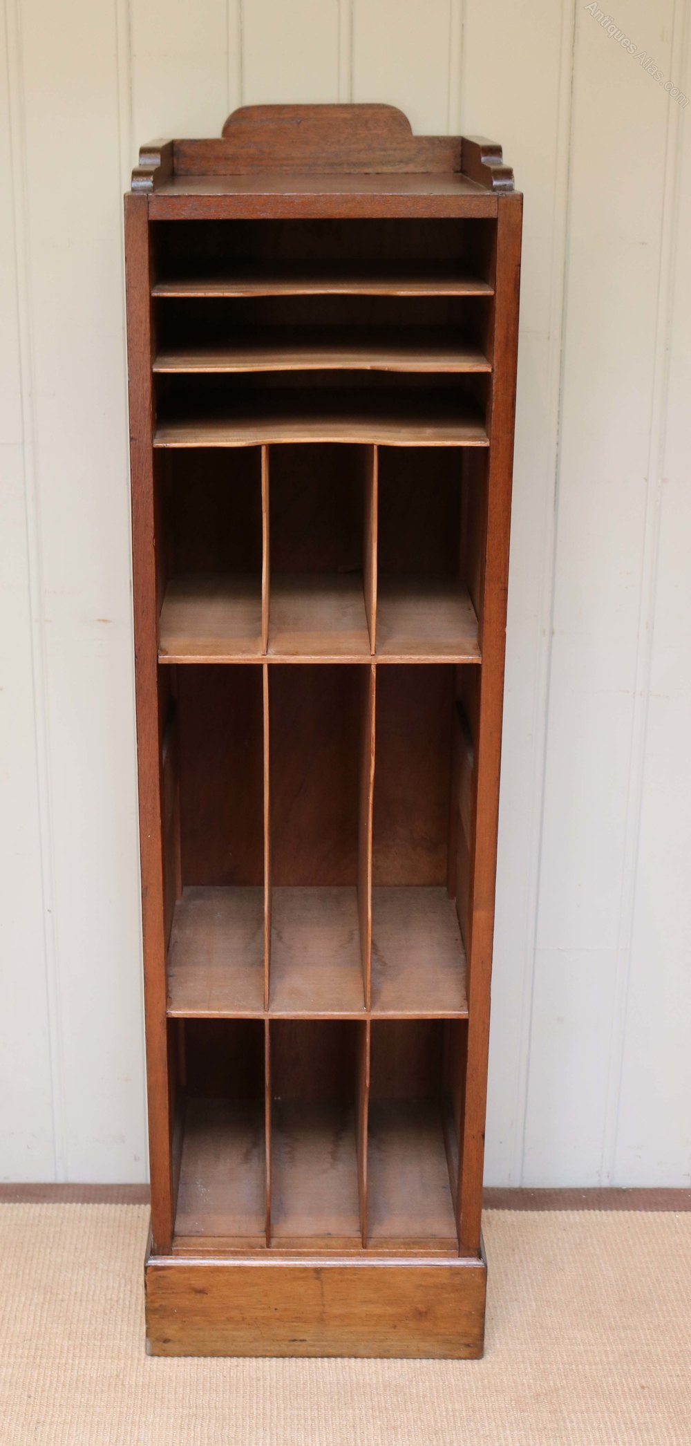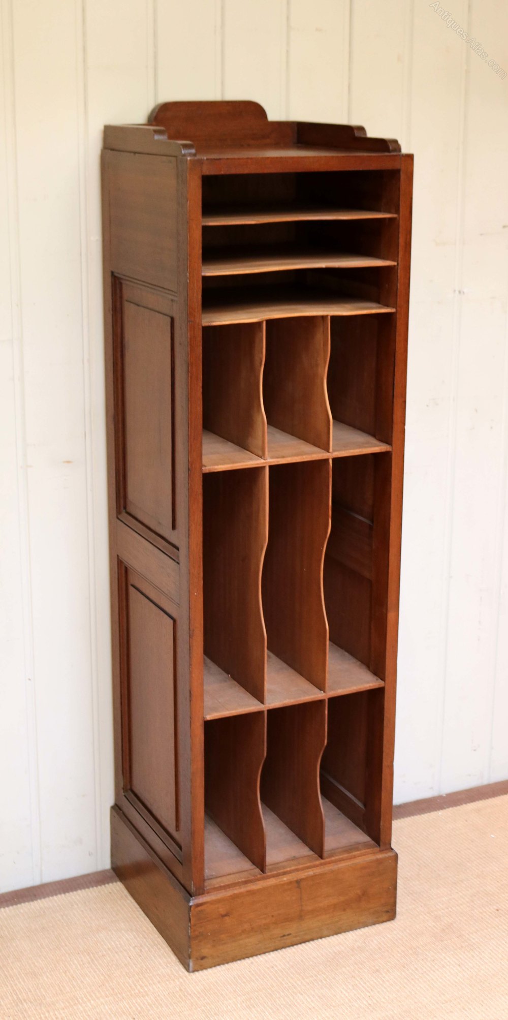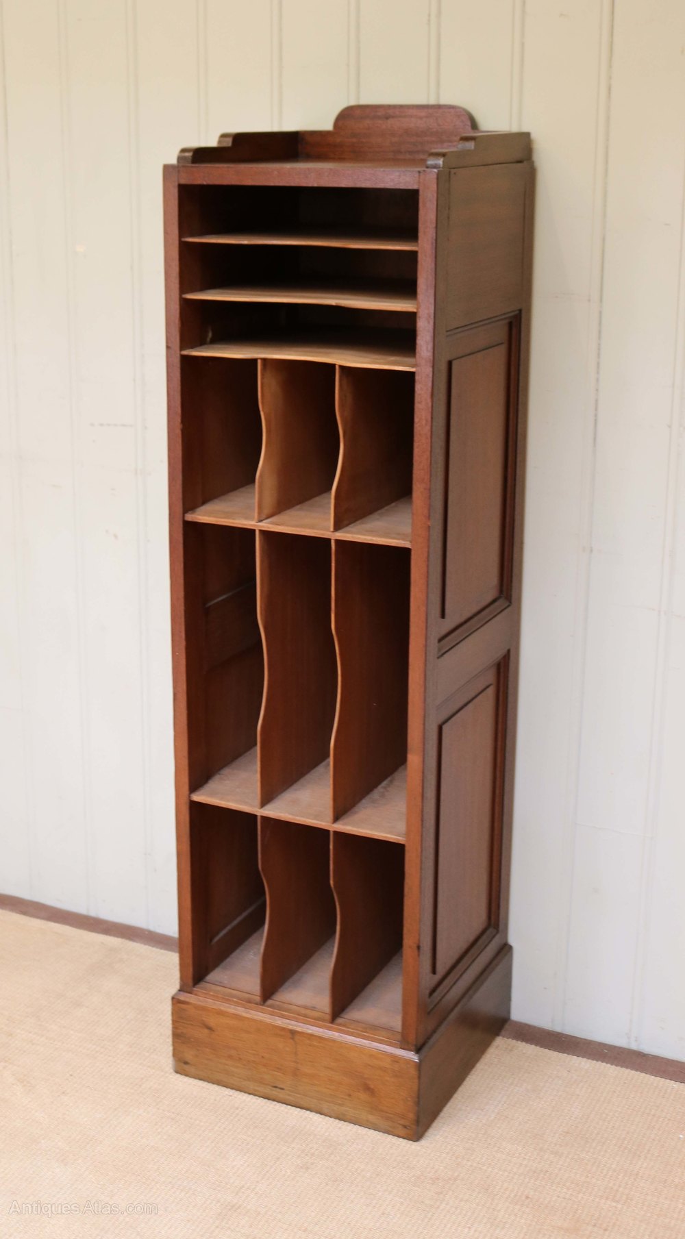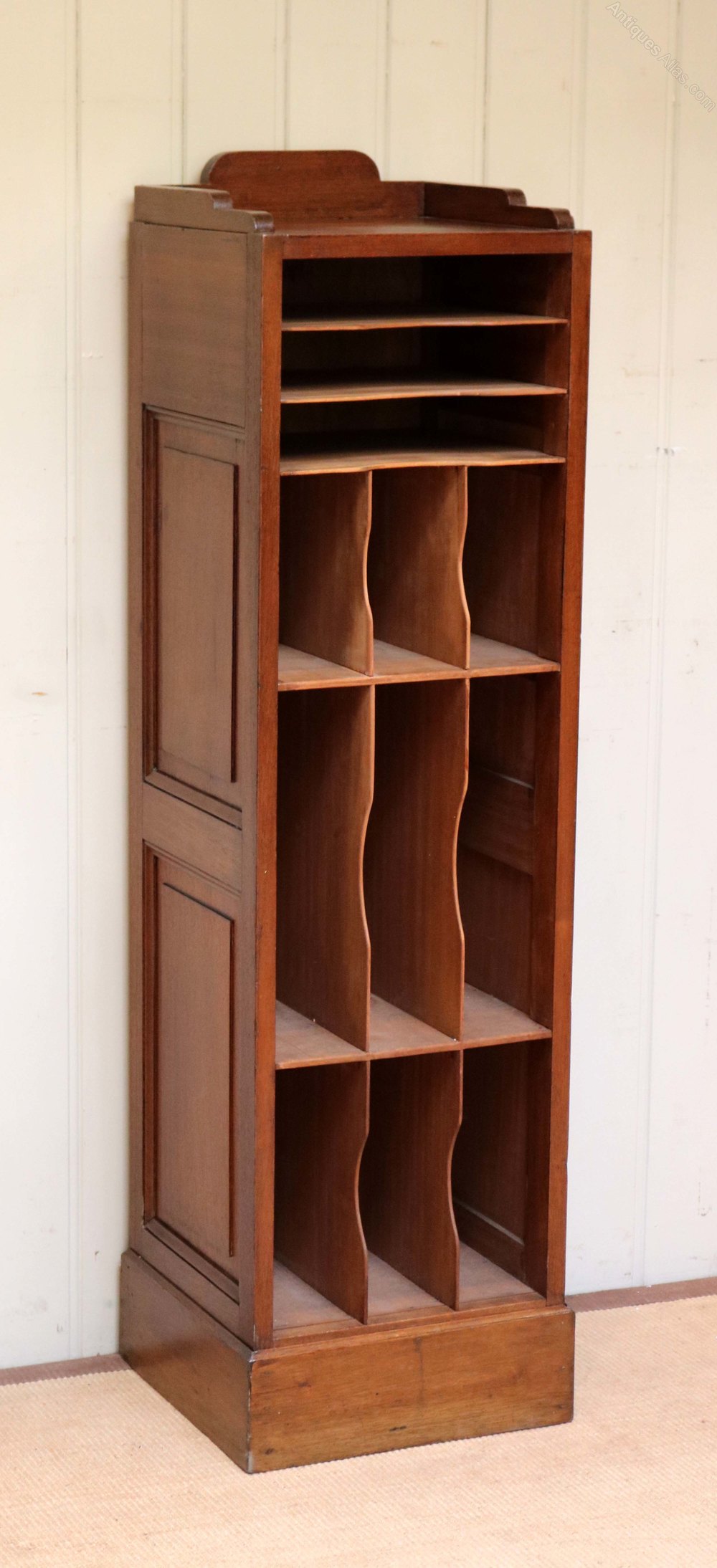 Tall French Walnut open filing cabinet having various sections with panelled sides raised on a plinth base