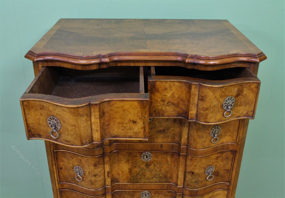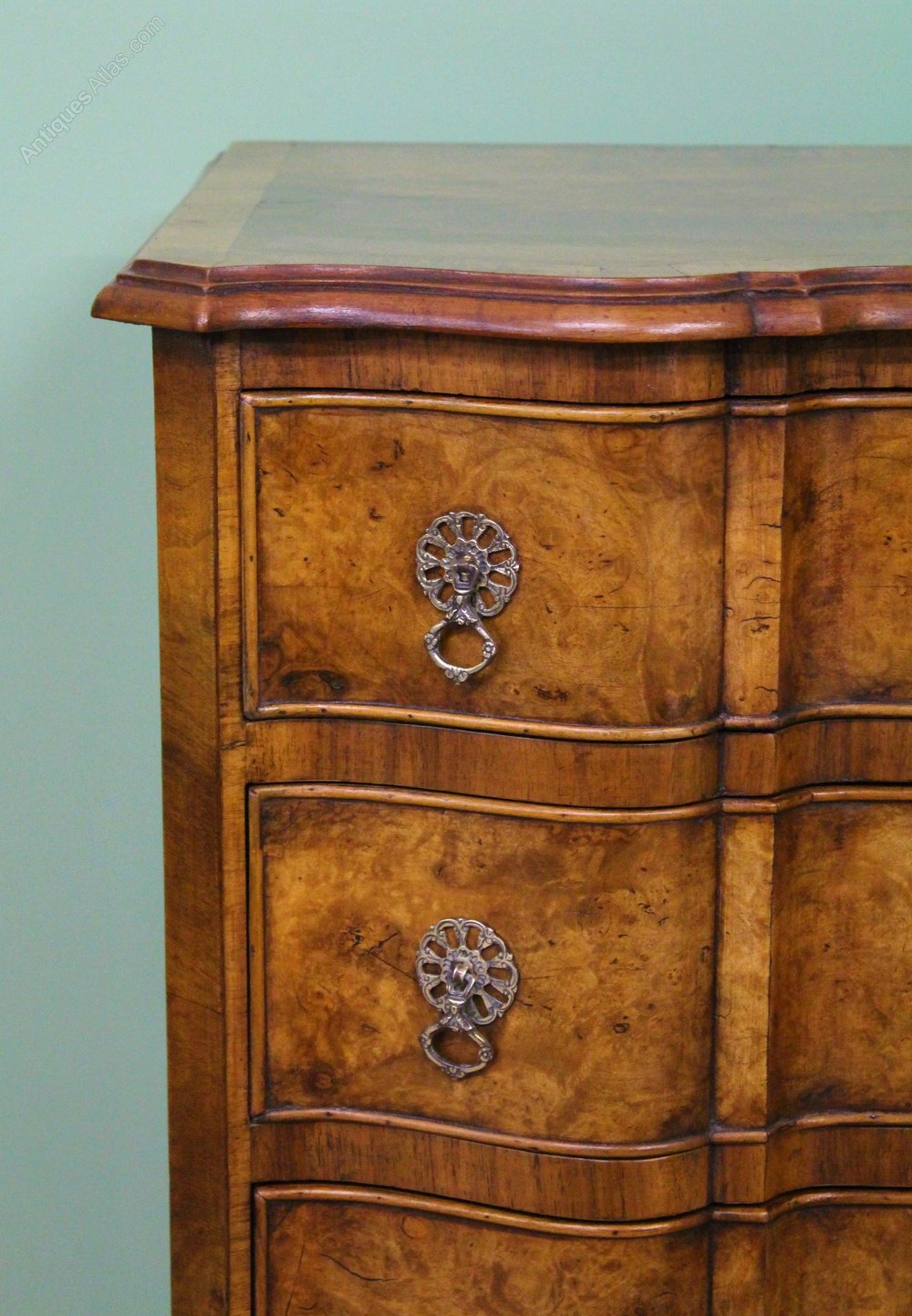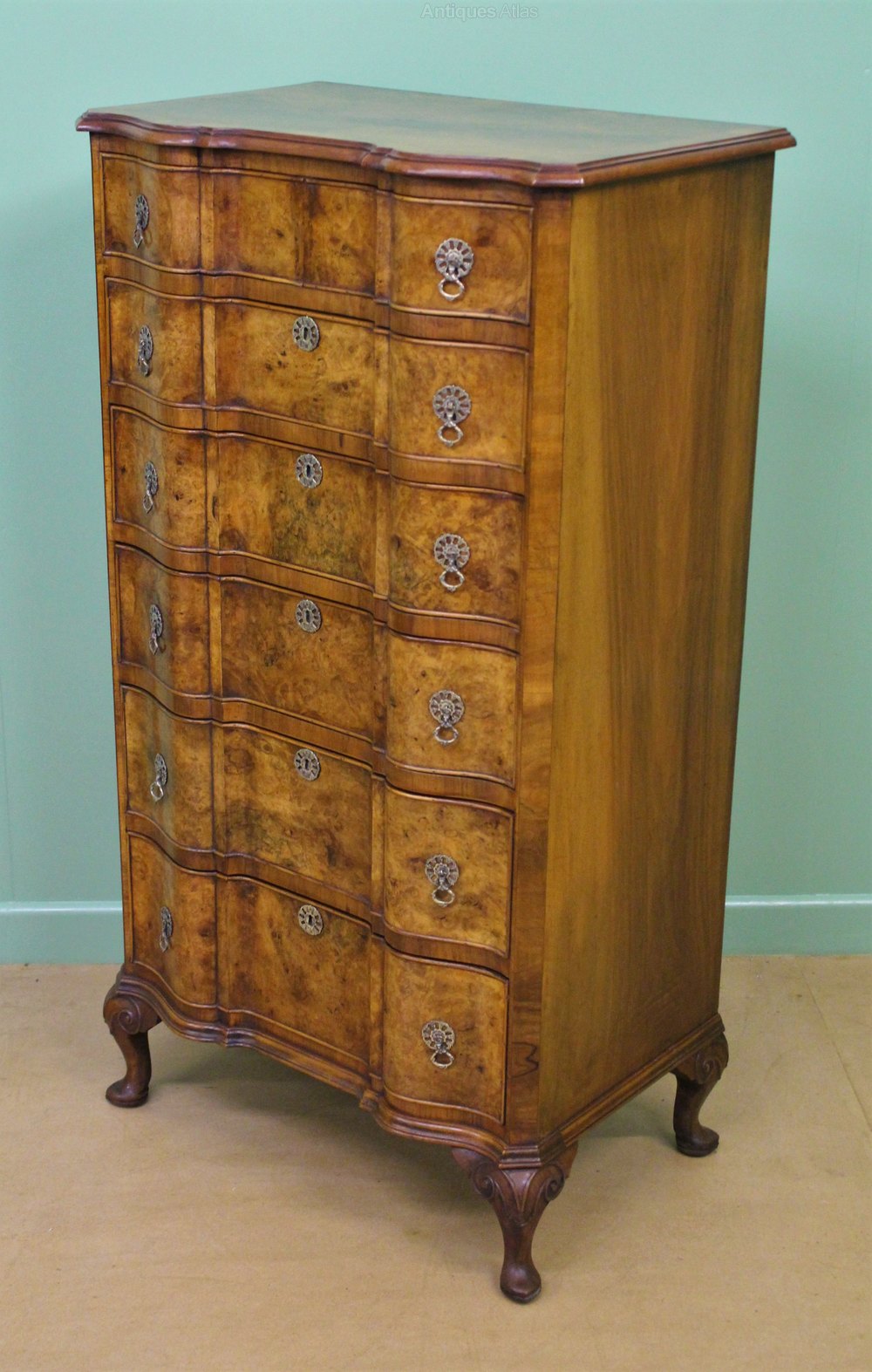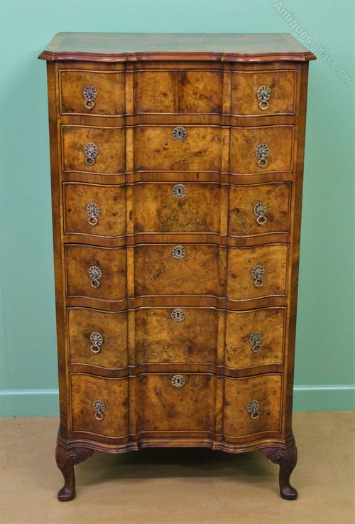 An attractive and practical tall burr walnut chest of drawers. Of serpentine fronted form and in the queen Anne style. Well made in solid walnut and attractive burr walnut veneers onto a solid oak carcas. With an arrangement of 2 short over 5 long, graduated drawers. All drawers are fitted with their charming original brass drop hoop handles. The top of the chest is cross banded and the whole piece stands on squat cabriole legs with carved detailing to the knees. Sympathetically refinished in our workshops and now offered for sale with a great colour and patina. In excellent overall condition, ready to go straight into the home.