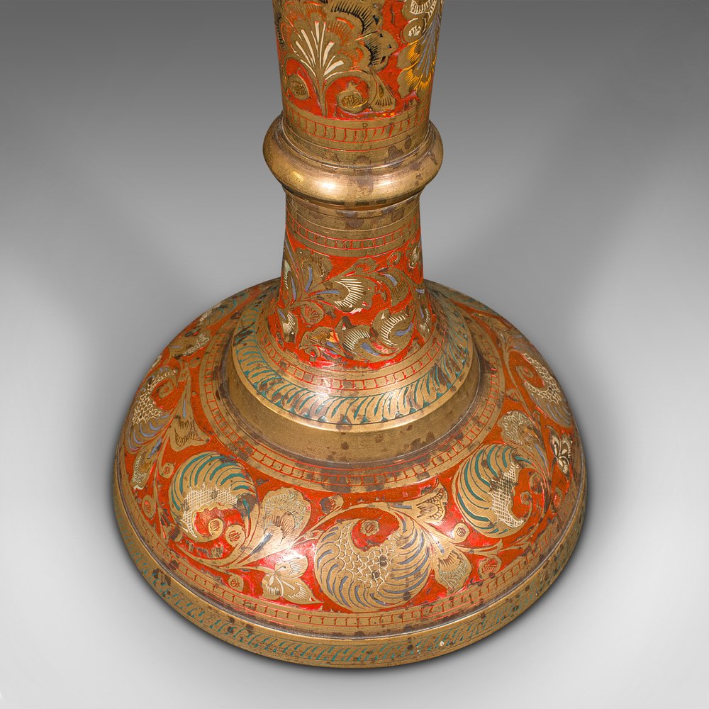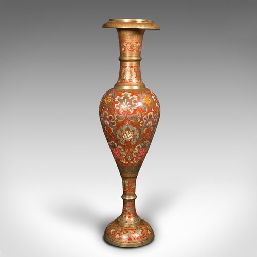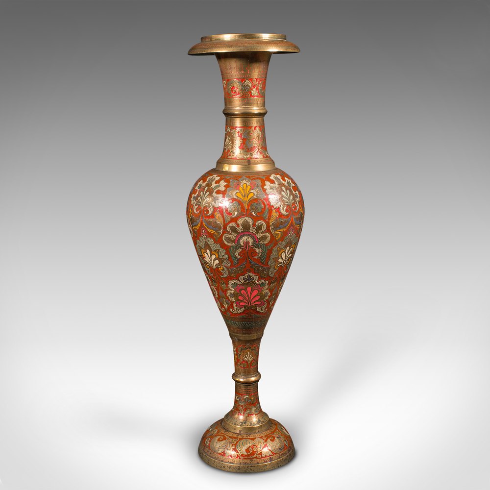 This is a tall vintage pampas grass vase. An Indian, polychrome enamelled brass display urn, dating to the mid 20th century, circa 1950.