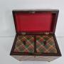 The inside has two storage compartments with removable lids with button knobs also covered in plaid tartan for storage of different teas. The compartments have remains of the finish to them.