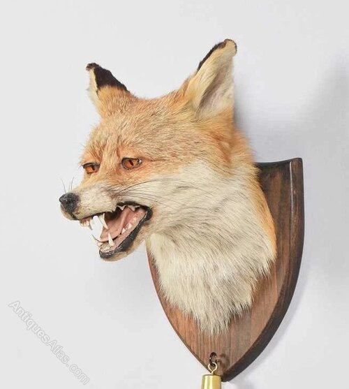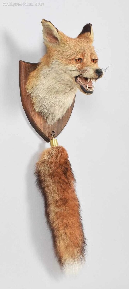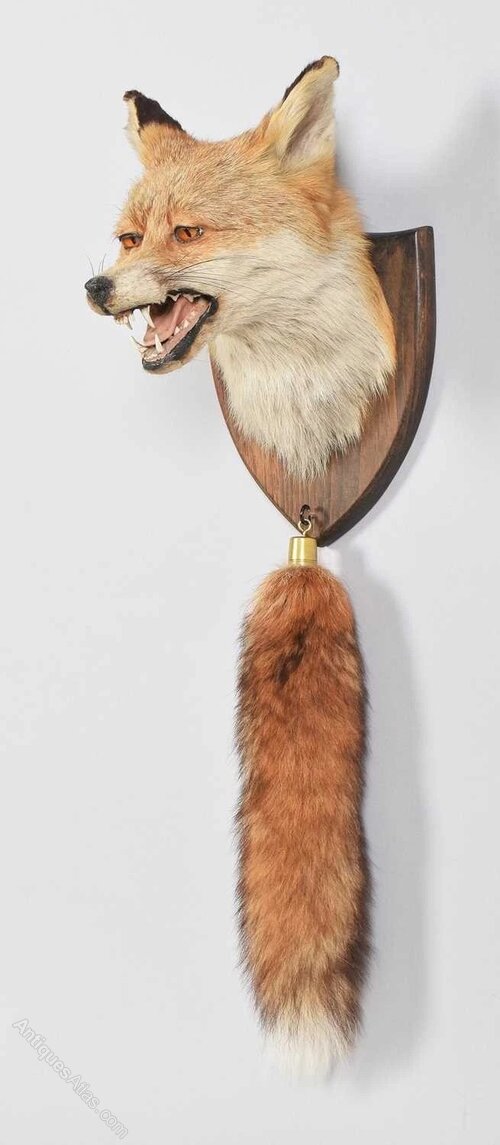 This is a very fine quality taxidermy of a red fox mask with attached brush reputedly by the skilled taxidermist JE Shelbourne 21 Amy Street Braunstone Leicester. The good quality adult male is posed looking straight ahead with glass eyes, mouth agape and snarling expression. The head is mounted on a solid oak shield with attached brush hanging from a solid capping brass mount.