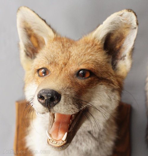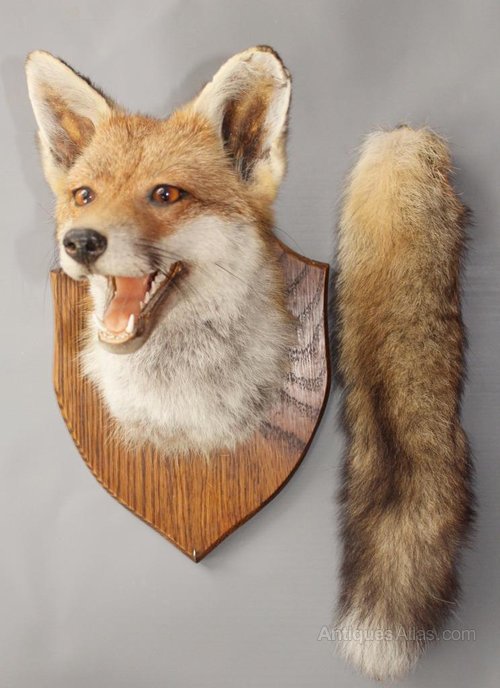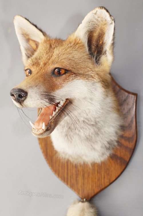 This is an extremely well modelled taxidermy fox mask with a great animated expression. The handsome fox has a great look mounted on this oak plaque and comes with its brush that hangs from the base of the shield. A very good example dating from the early 20th century.