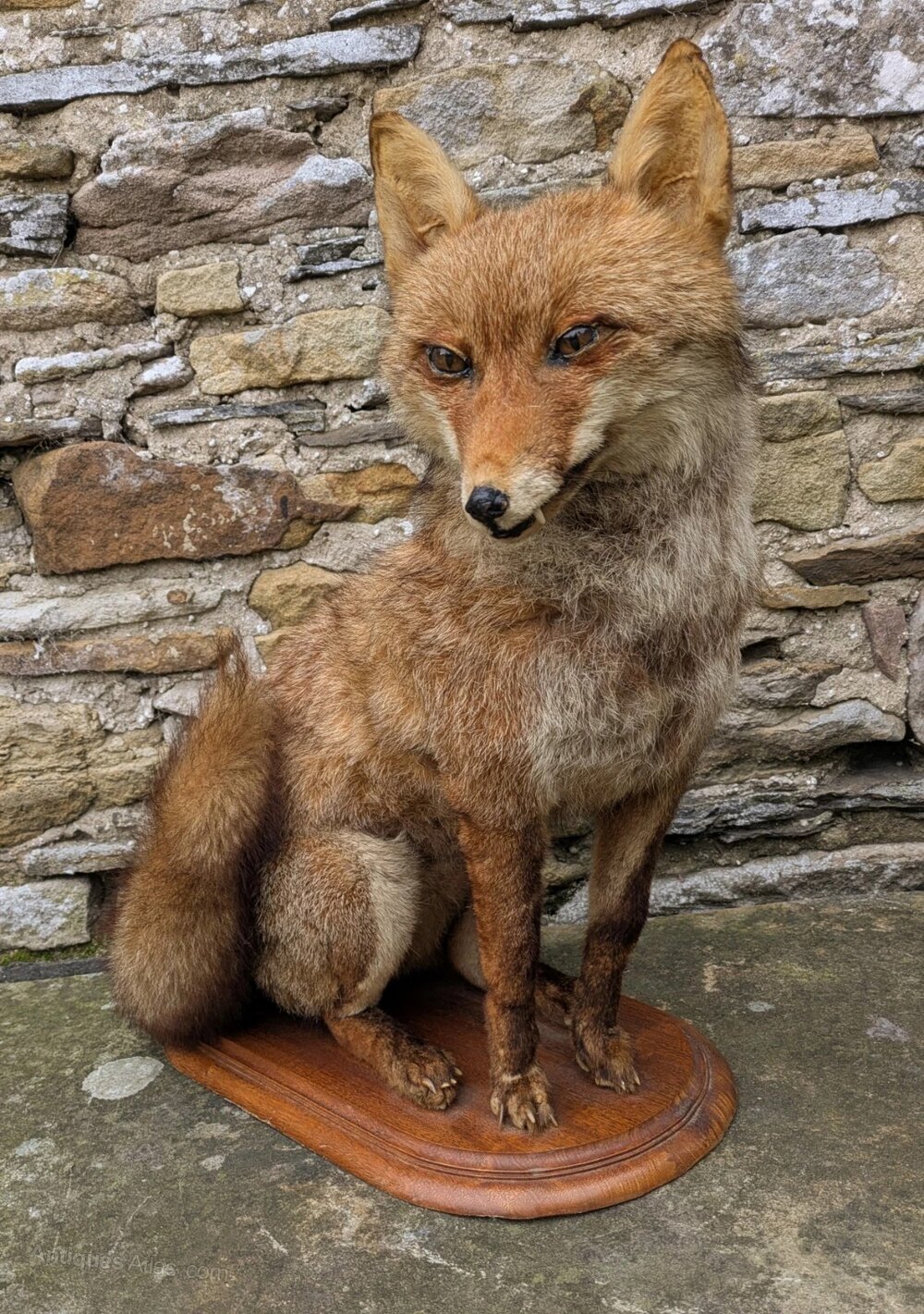 The fox is well modelled, posed in the seated position mounted on a solid oak oval base.