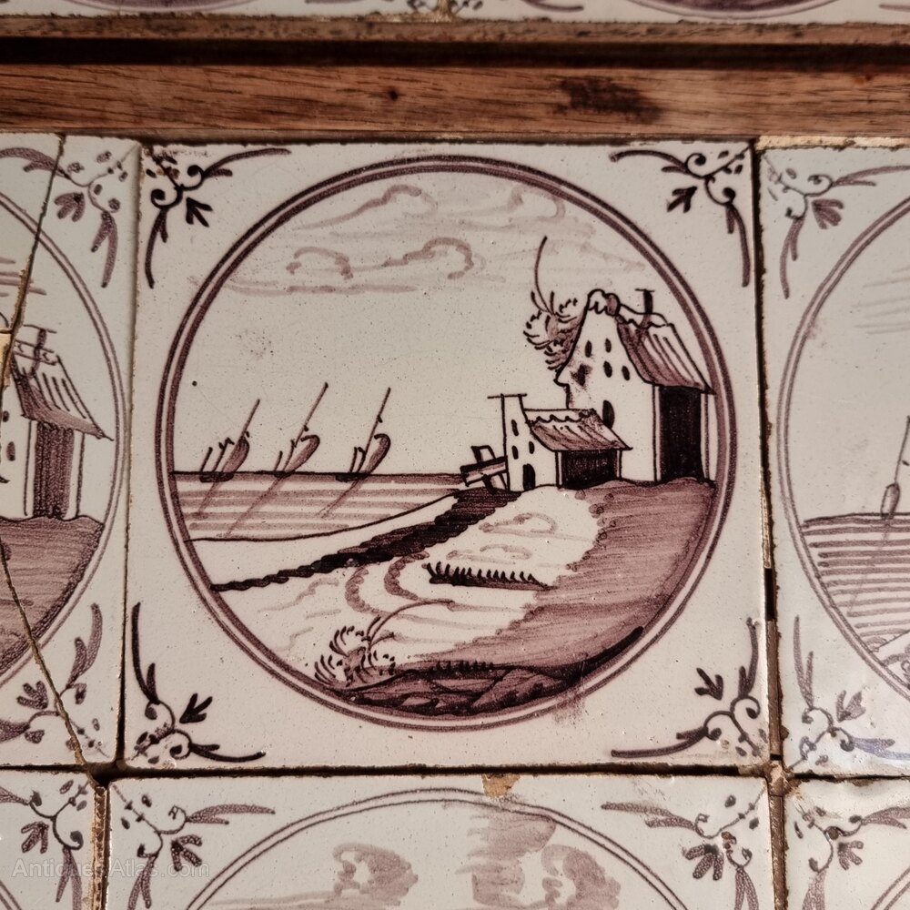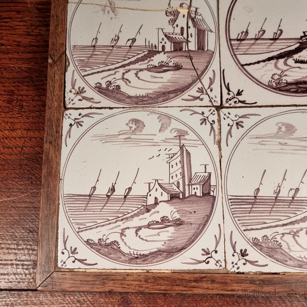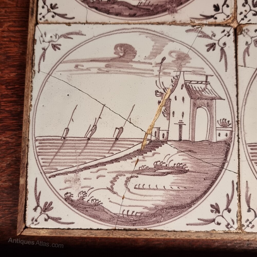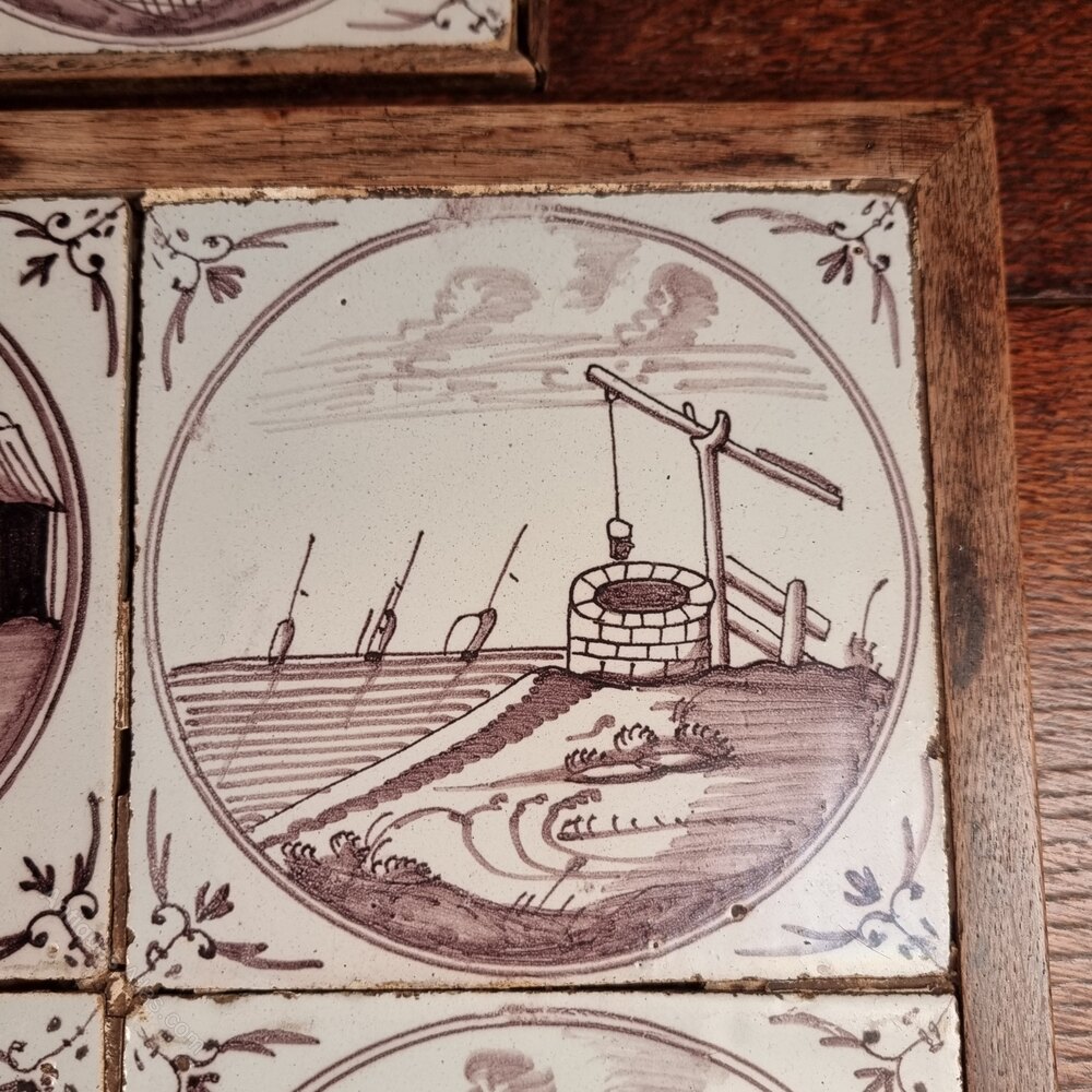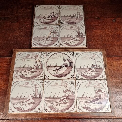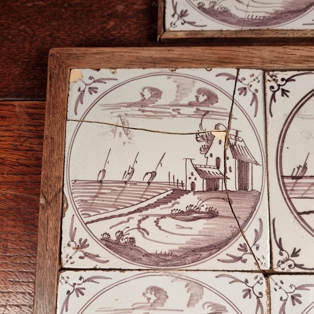 A set of ten 18th century manganese delft tiles depicting various scenes. The tiles are in relatively good order with some having breaks cracks and chips commensurate with age. Both lots have been set in oak frames at some stage with the smaller set of four having part of the frame missing, however this could be easily fixed if you wish. The would look fantastic used as a splash back for a bathroom sink in a period home.
