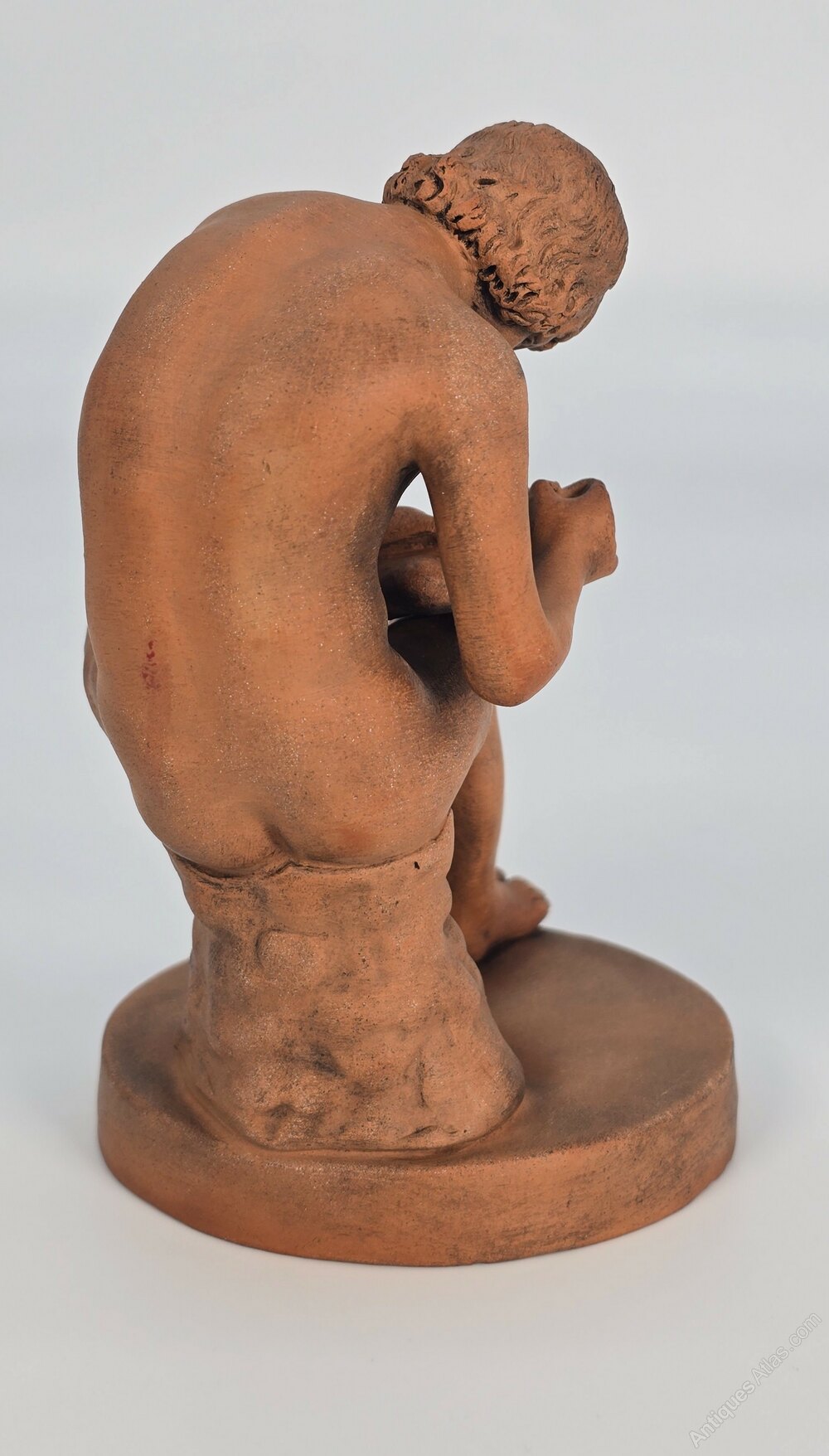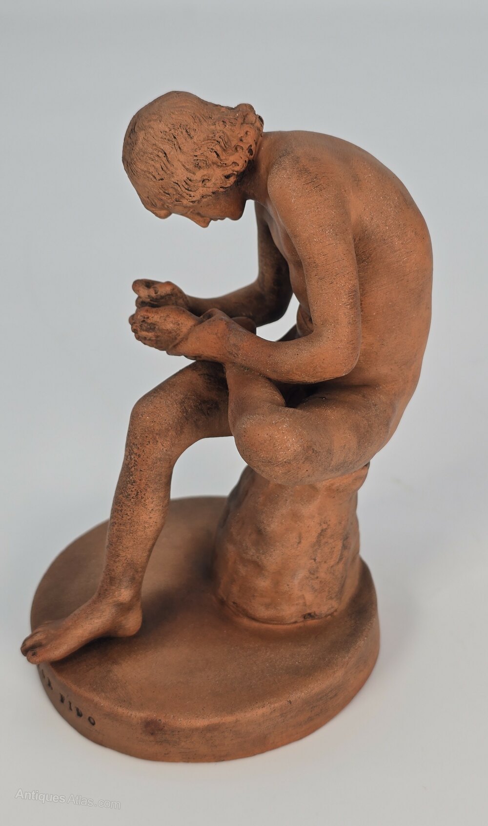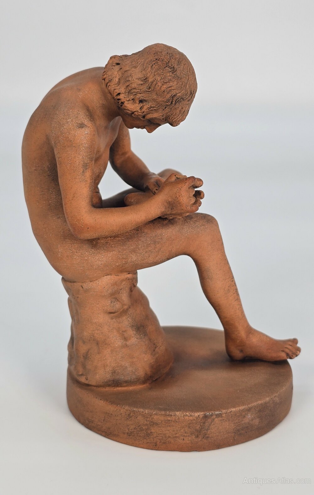 A superbly detailed small terracotta sculpture of the classical Italian Grand Tour figure of Spinario, or boy with a thorn, who was a devoted shepherd boy.