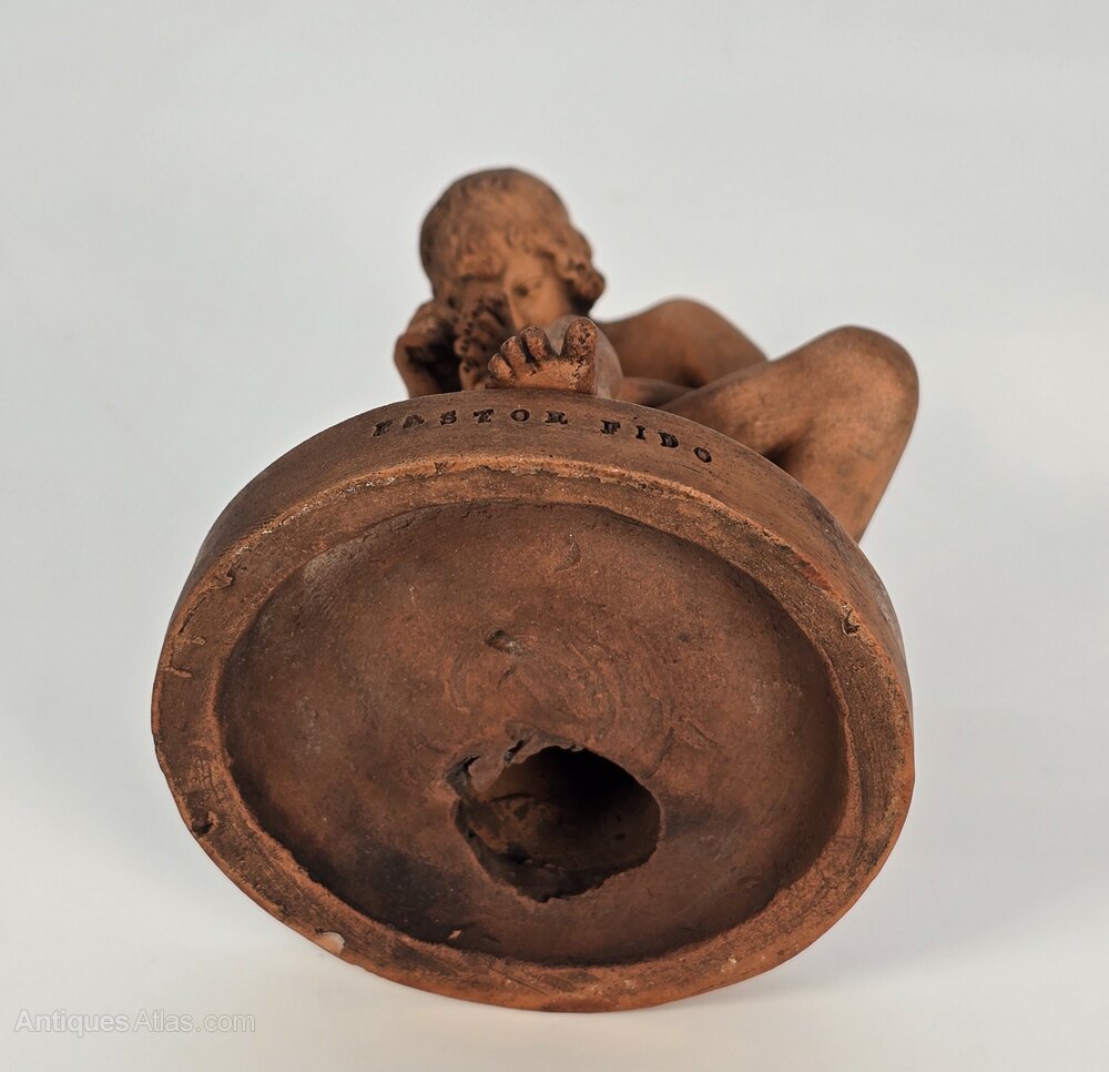 The figure has been modelled with a circular base, and the front face is the hand impressed words Pastor Fido, meaning Faithful Shepherd.