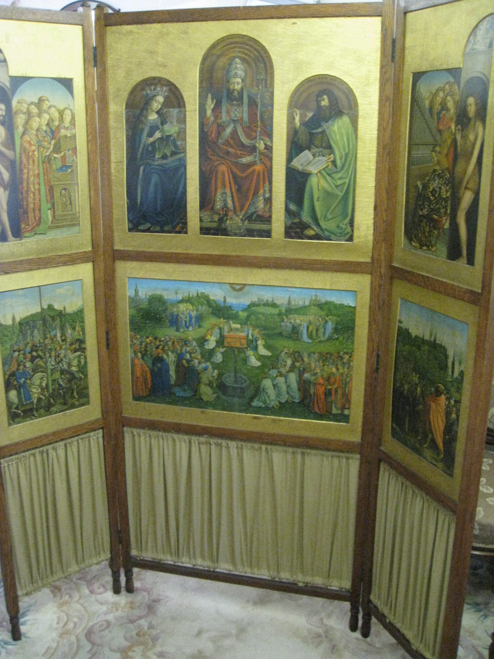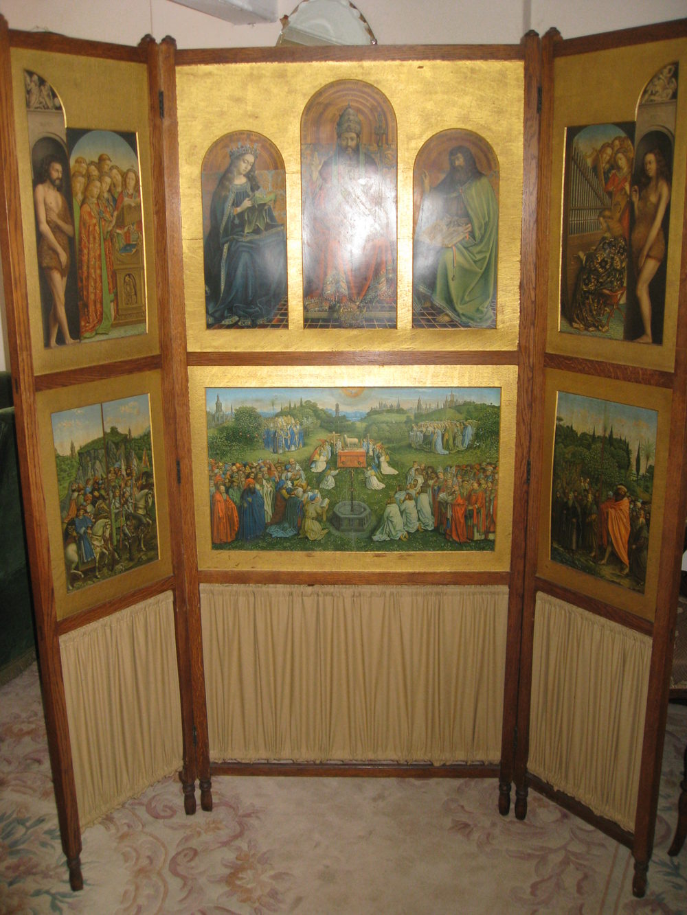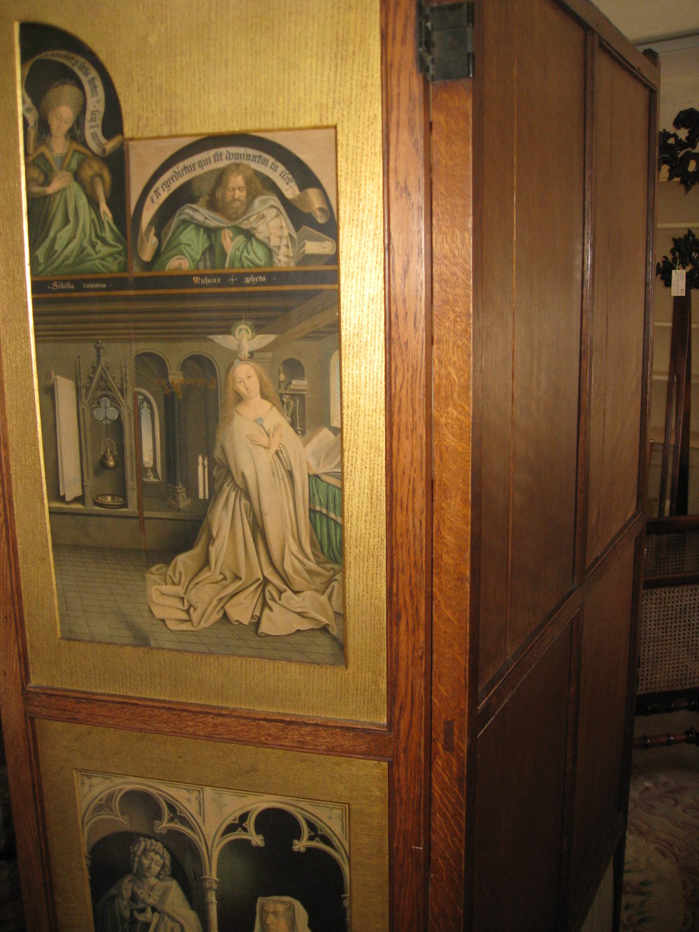 Three fold room screen. This a most unusual screen with panels depicting various religious scenes including adam and eve in gilded wood surrounds. It is very difficult to capture it well enough in photographs to do the screen justice, it really is very decorative. Please contact us for further details. Reasonably priced delivery available. Debit / credit card payment facility.