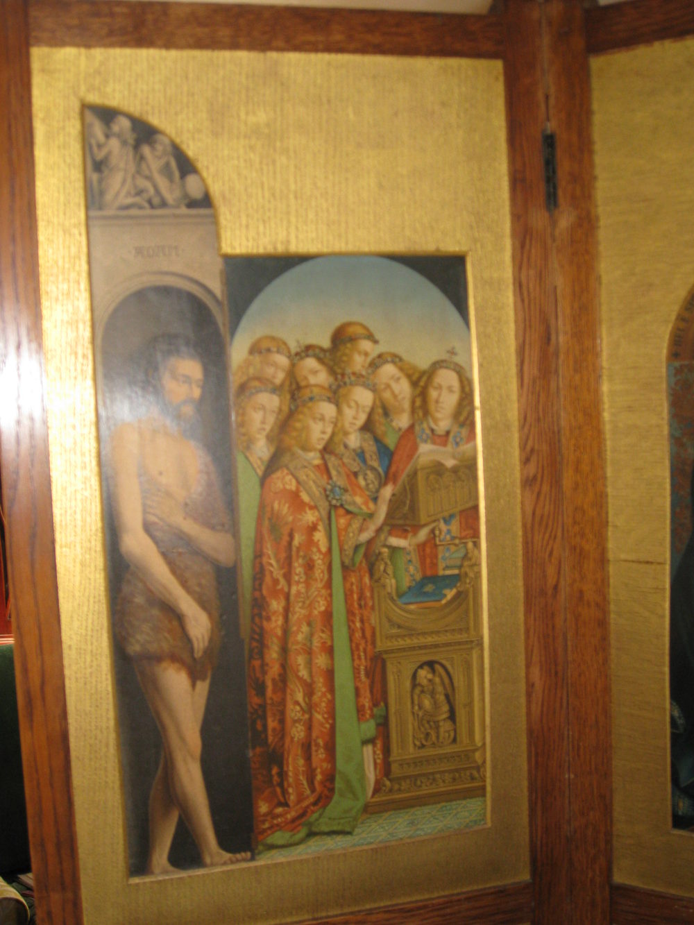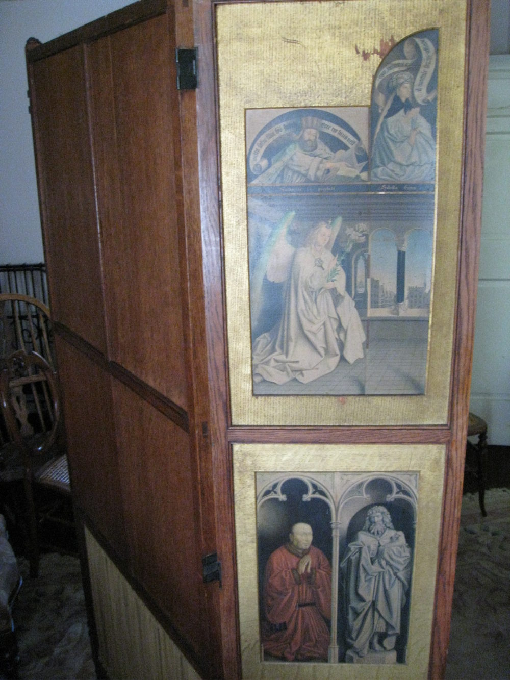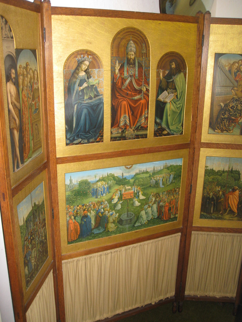 Three fold room screen. This a most unusual screen with panels depicting various religious scenes including adam and eve in gilded wood surrounds. It is very difficult to capture it well enough in photographs to do the screen justice, it really is very decorative. Please contact us for further details. Reasonably priced delivery available. Debit / credit card payment facility.