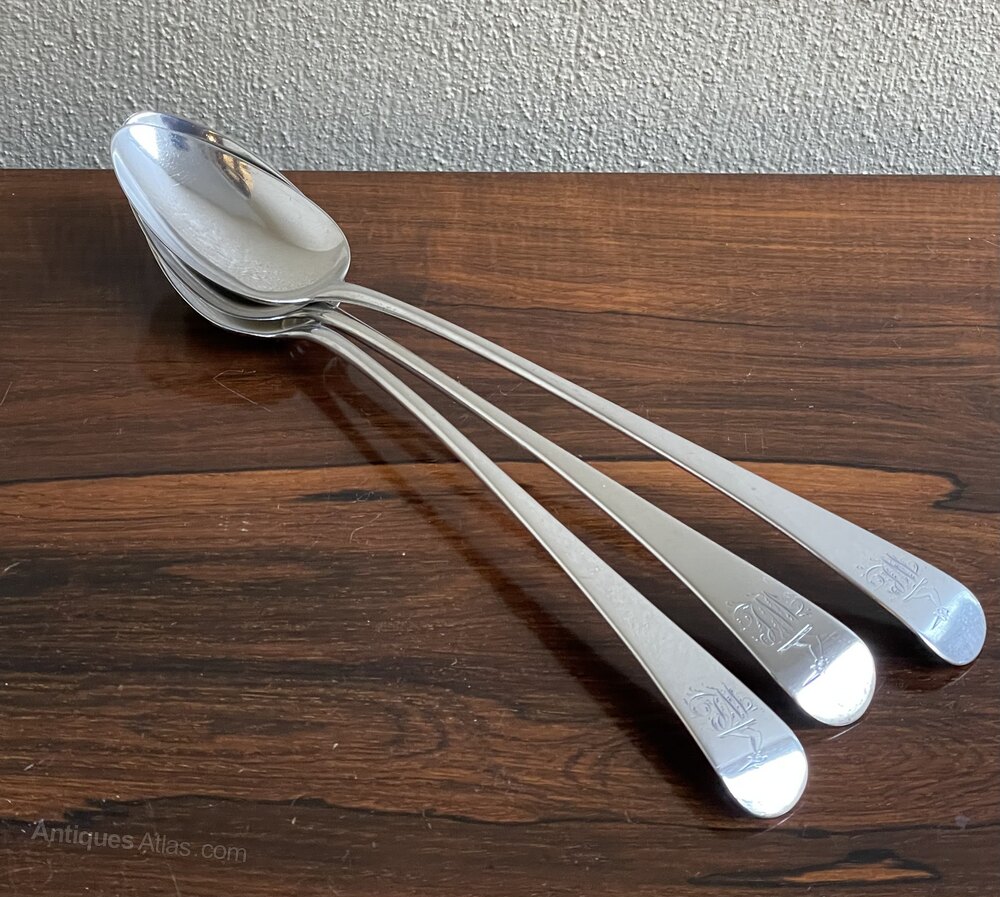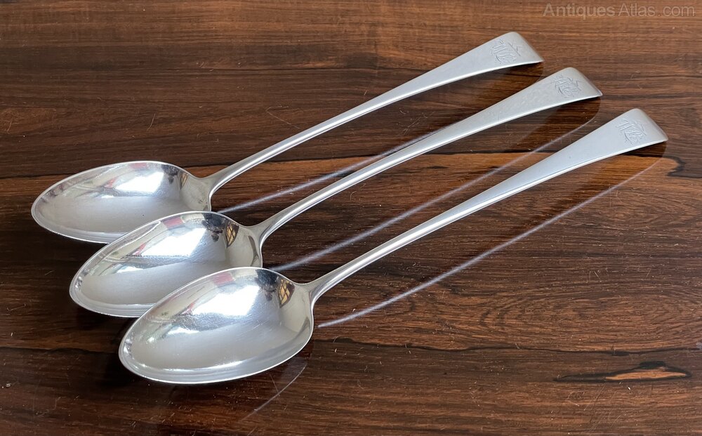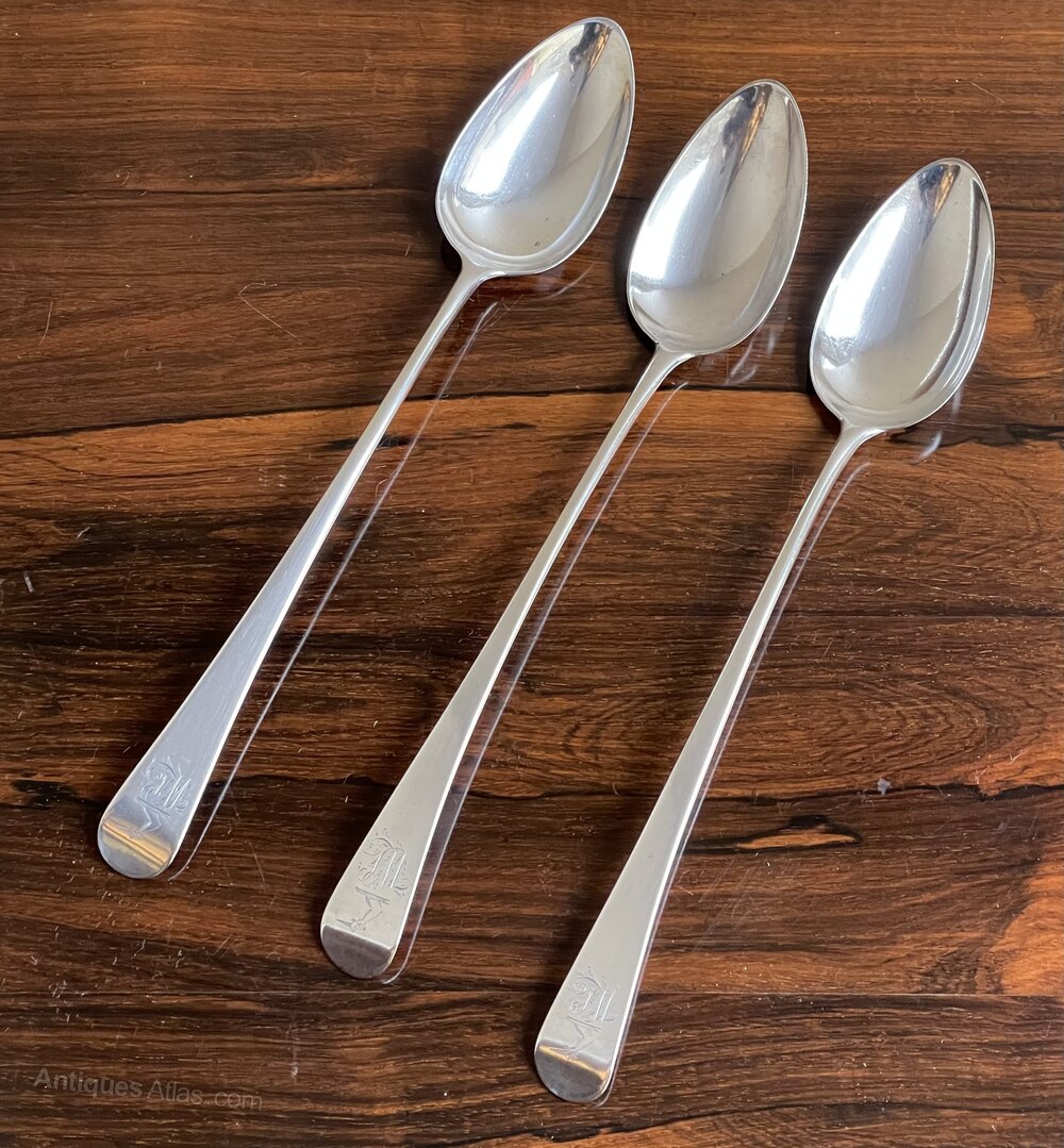 A good set of three George III solid silver basting spoons. Fully hallmarked for London 1797 by William Sumner. Crested.