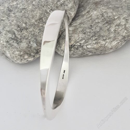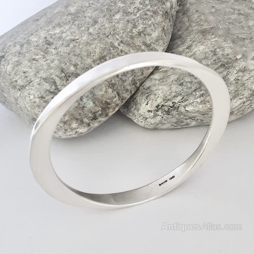 A superb mid century (1960s) Norwegian bangle by Tone Vigeland. Elliptical in shape this bangle is beautifully hand crafted in sterling silver by an artisan of great repute. Vigeland has examples of her creations in museums worldwide. The bangle is effortlessly stylish and elegant offering the wearer a chance to wear vintage yet look contemporary.