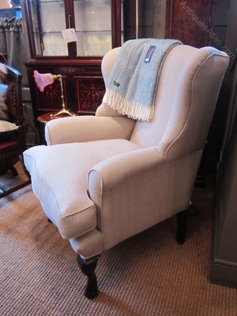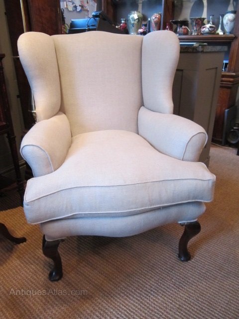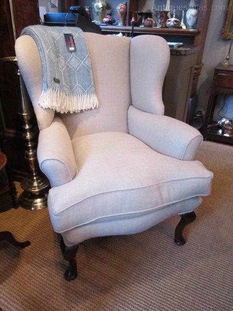 A Top Quality George III period wing back armchair.c.1800. Horse hair upholstery and a feather filled loose cushion seat. Standing on mahogany cabriole shaped legs.Recovered to a high standard in Slub oatmeal linen fabric. Measures 34" x 36"deep x 42"high, seat 20"high.
