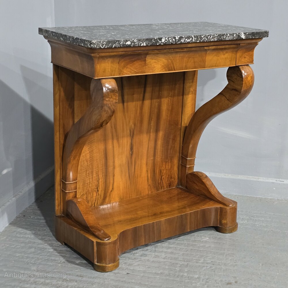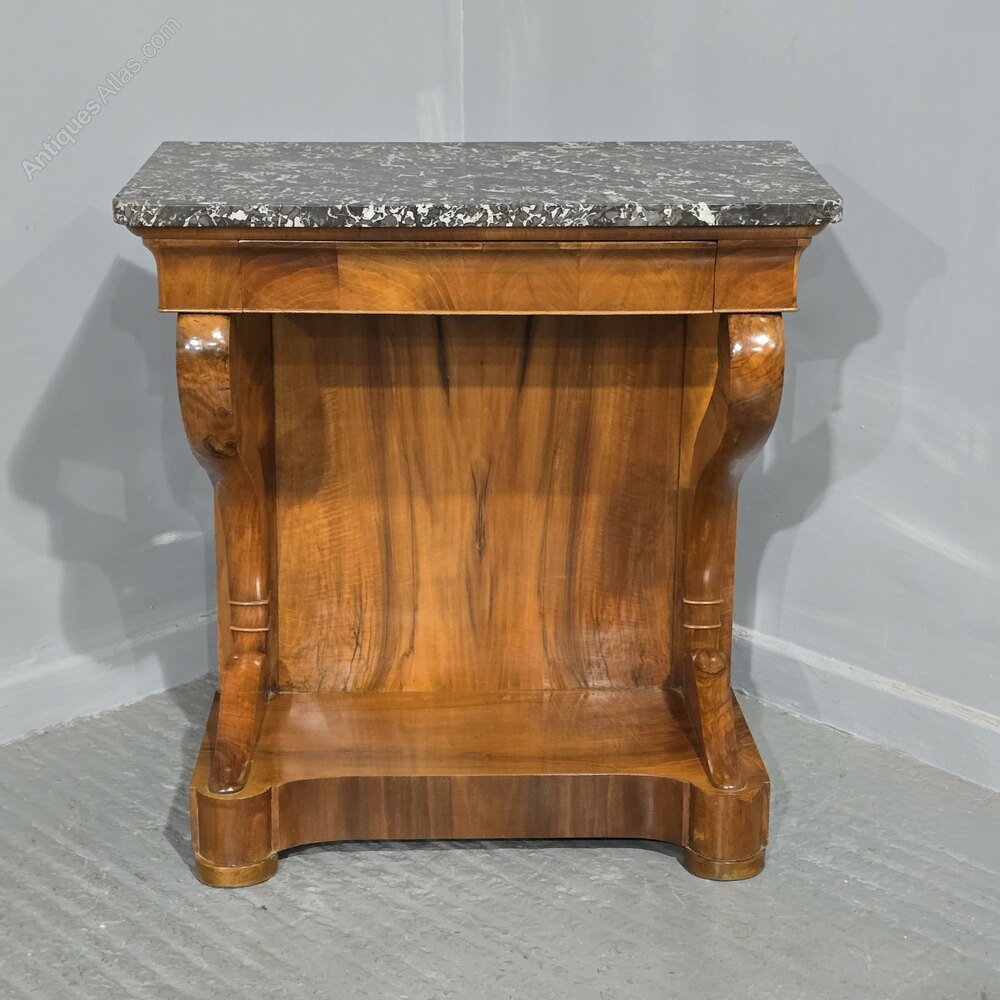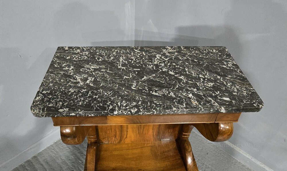 Super quality French figured walnut console table with single full width drawer and varigated grey marble top, in excellent overall condition.