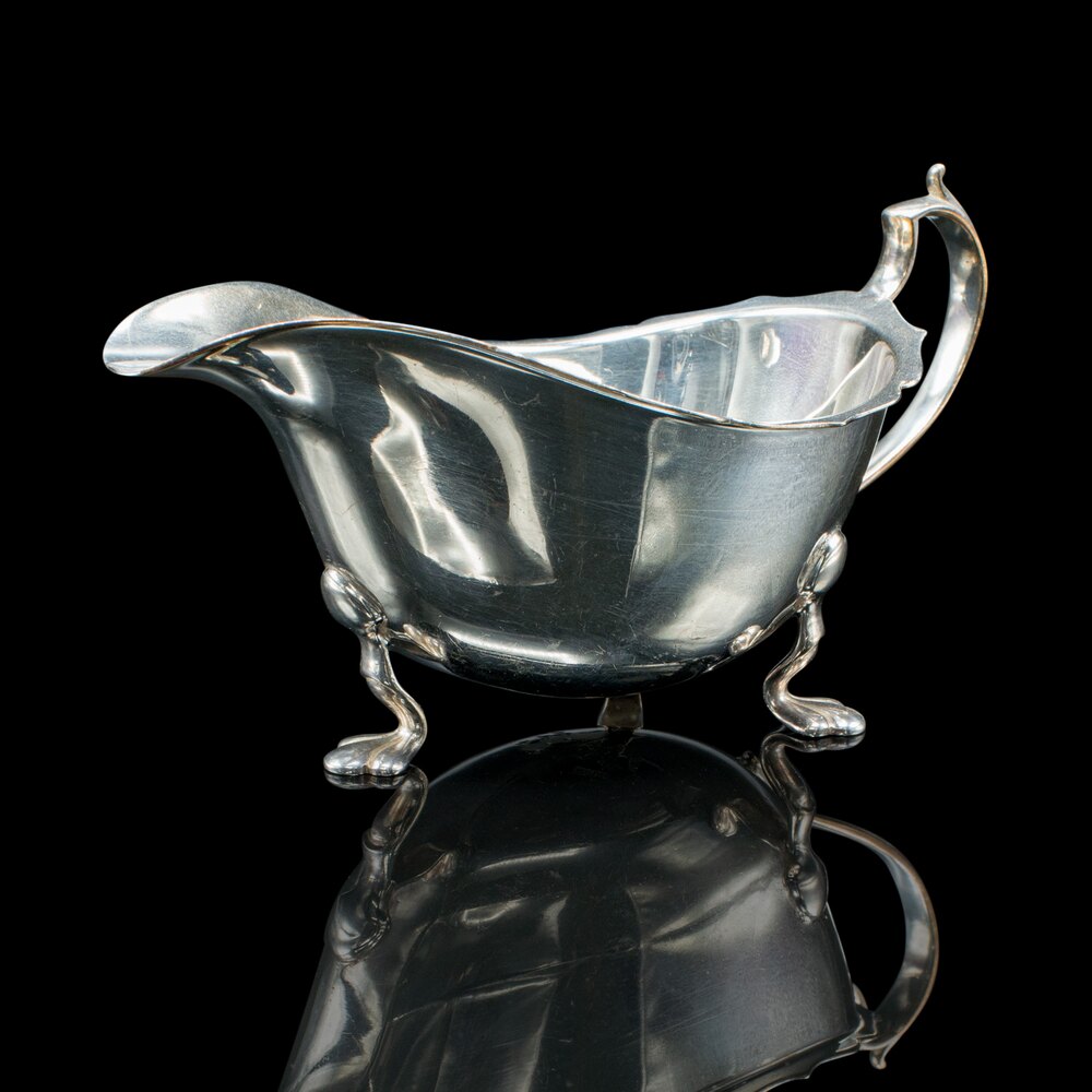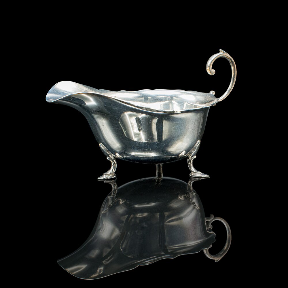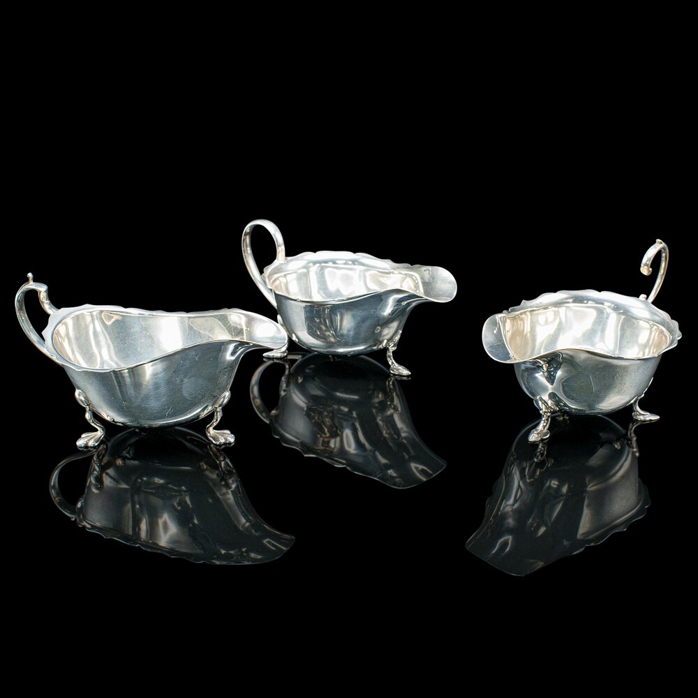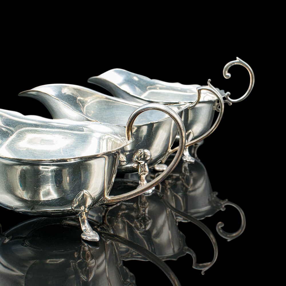 This is a trio of antique sauce dishes. An English, silver plated condiment pot set, dating to the Edwardian period, circa 1910. Delightfully presented, these small serving dishes offer a refined way to present condiments at the dinner table.