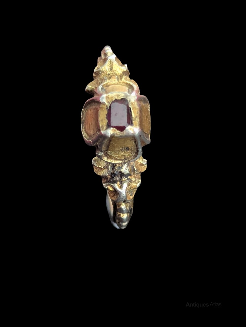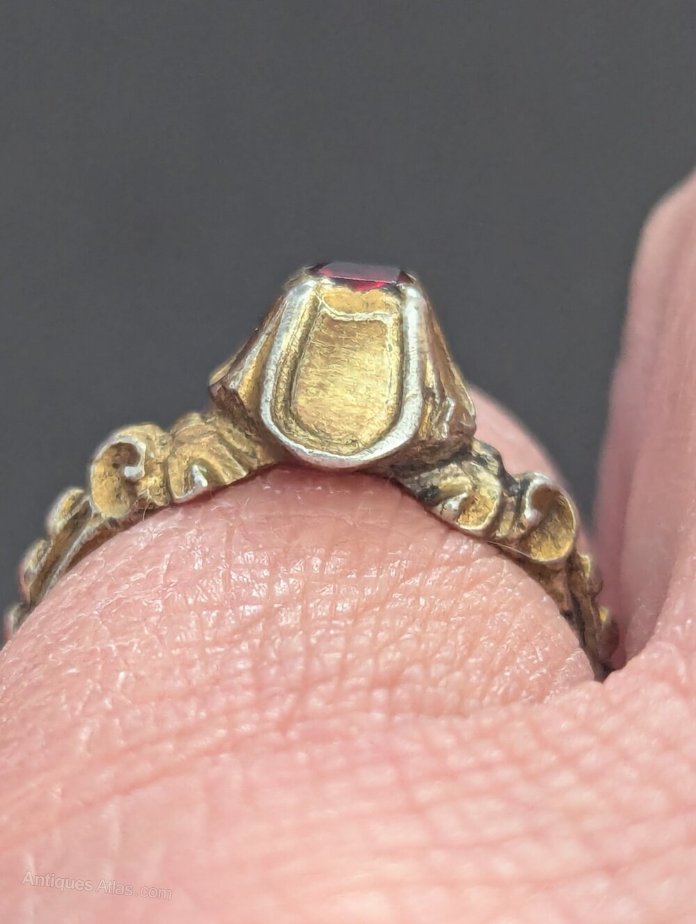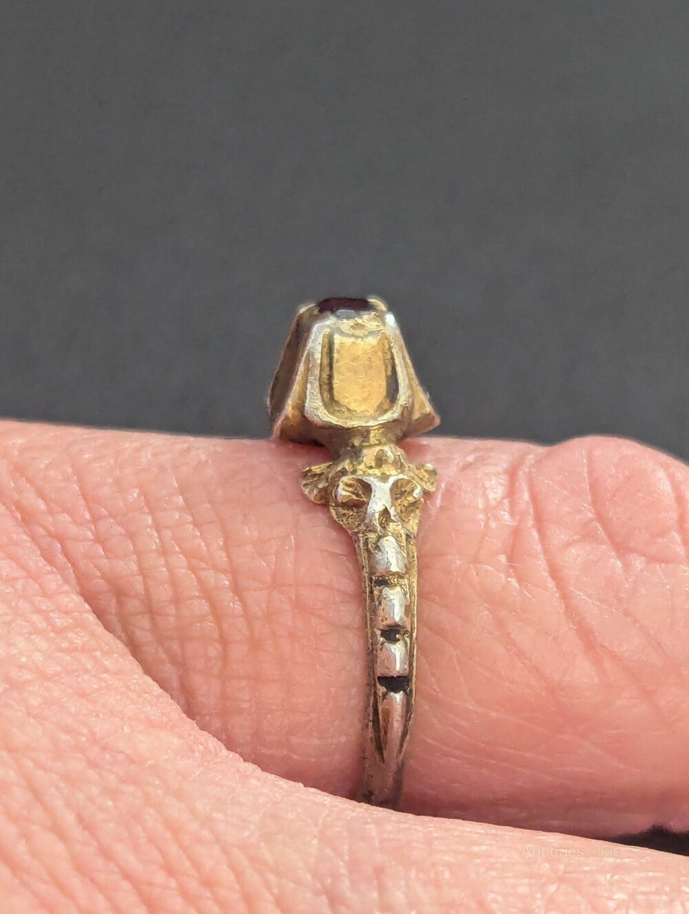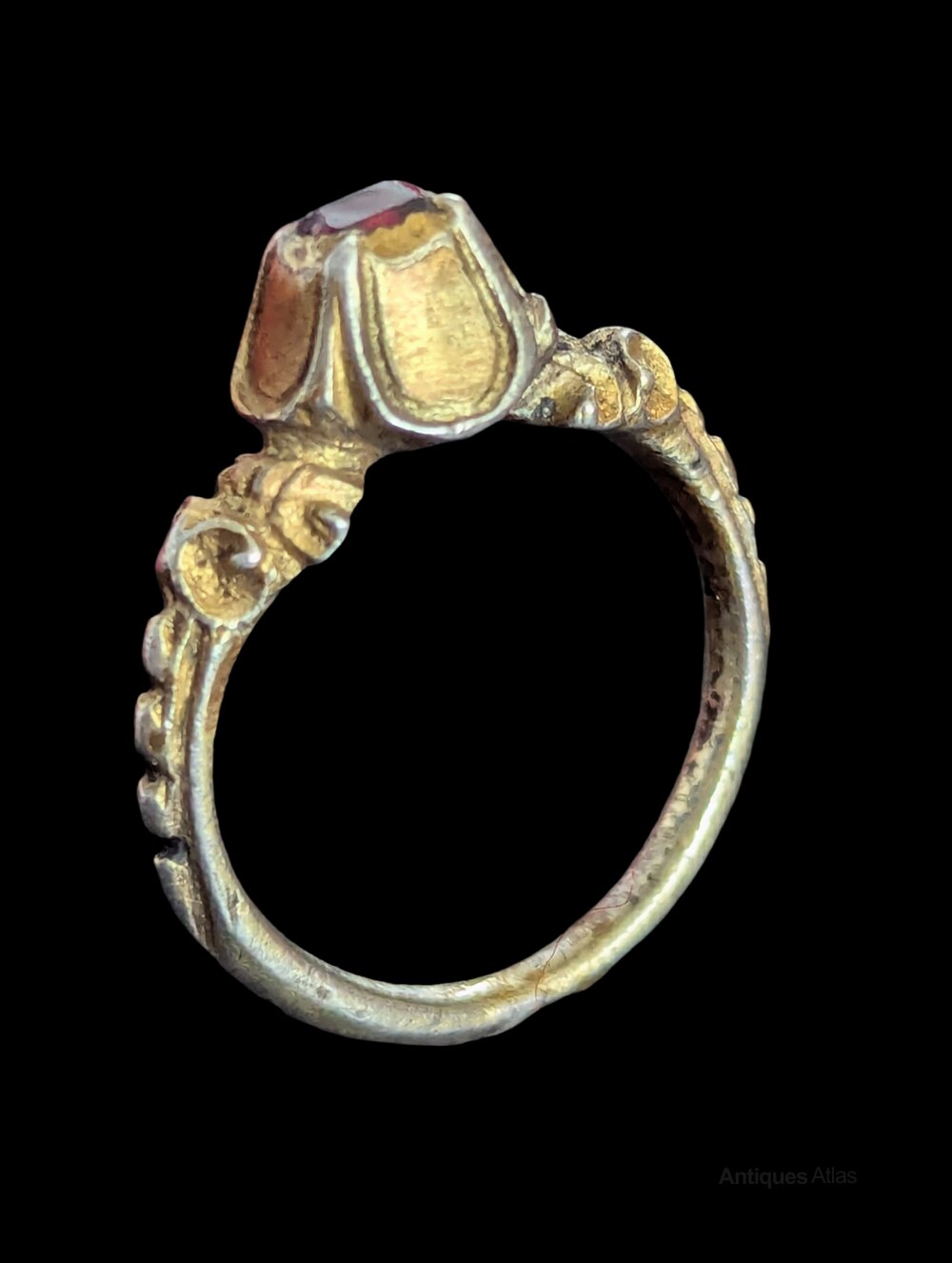 A gorgeous Renaissance period Silver - Gilt ring with it's original table cut garnet. The gem sits within a raised cusp quatrefoil along with decorated shoulders and band.