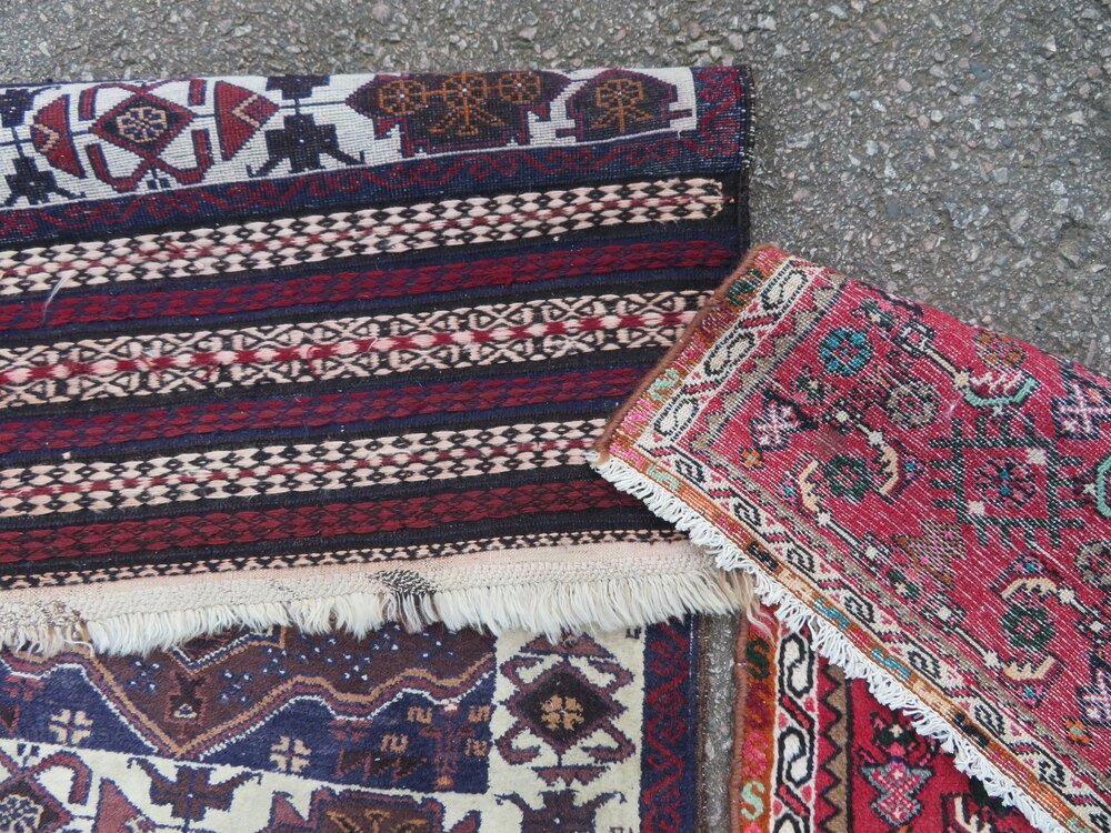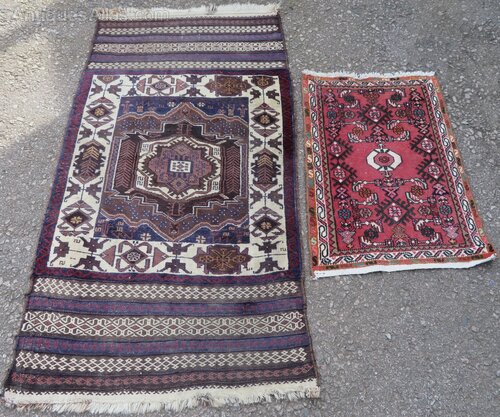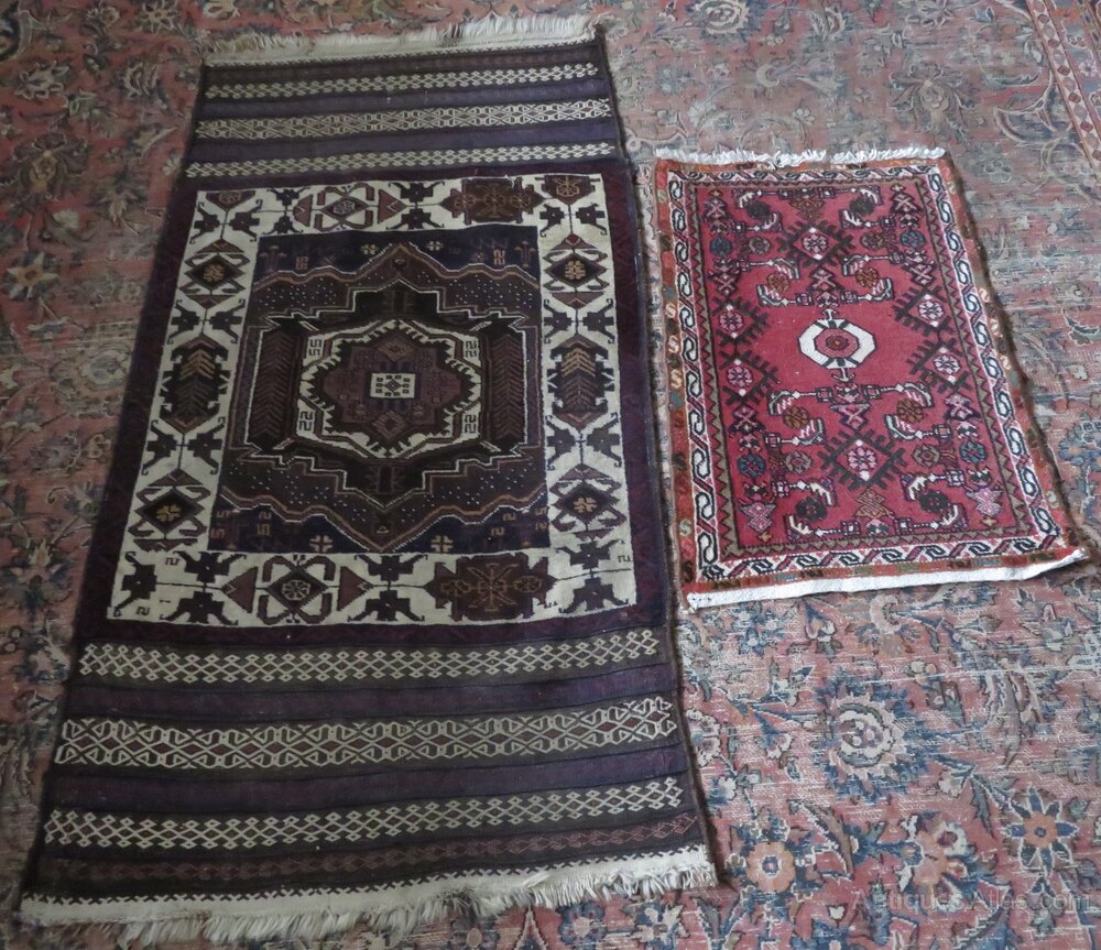 Both persian. Larger one with broad flat woven and brocaded ends. Both in very good condition. Larger one all wool weave. Smaller one wool pile on cotton. Sizes in title description fringes not measured in size. U. K post £16 for both. Now selling very reasonably priced items that won''t break the bank. Fos 30