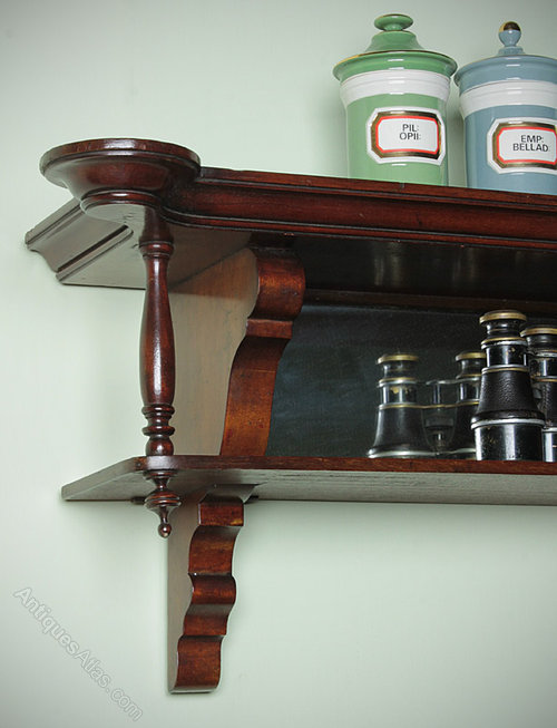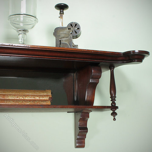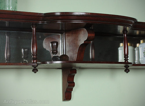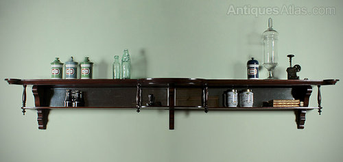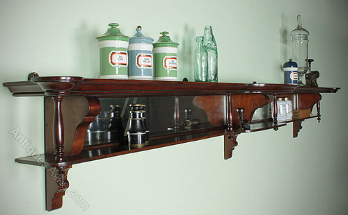 Excellent quality two tier mahogany apothecary shop display shelf c.1900. Over seven feet in length with shaped and molded upper shelf, crisply turned finials and shaped brackets. Retaining the original mirrored back panels and brass fixings. Excellent coloour and condition.