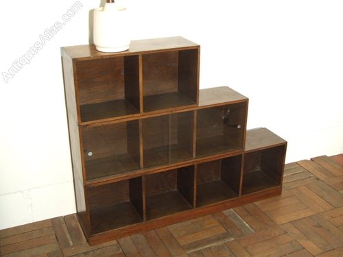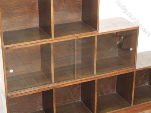 Three separate sectional units with detached plinth manufactured by Unix, England .In solid oak with stained plywood back panels.