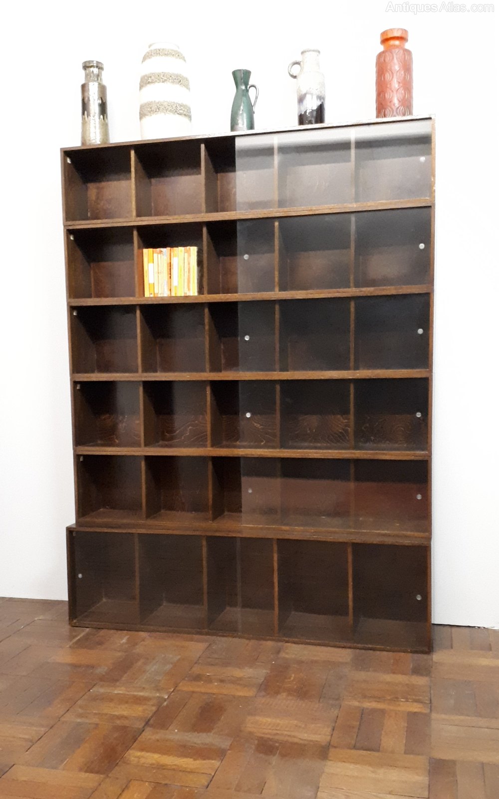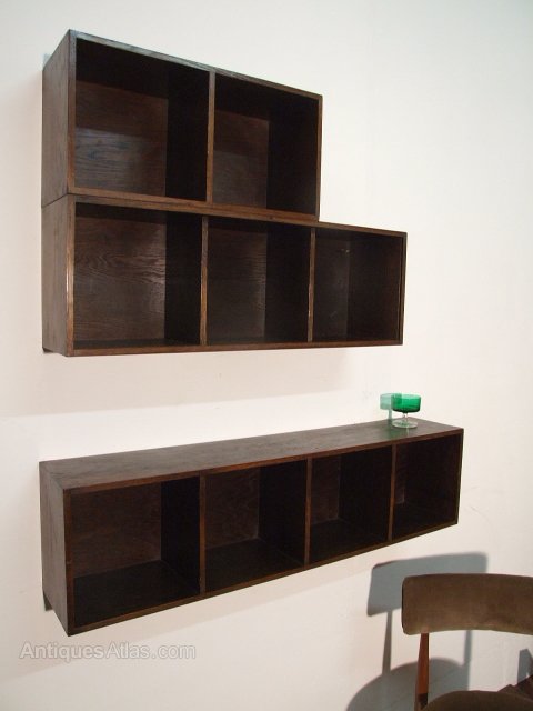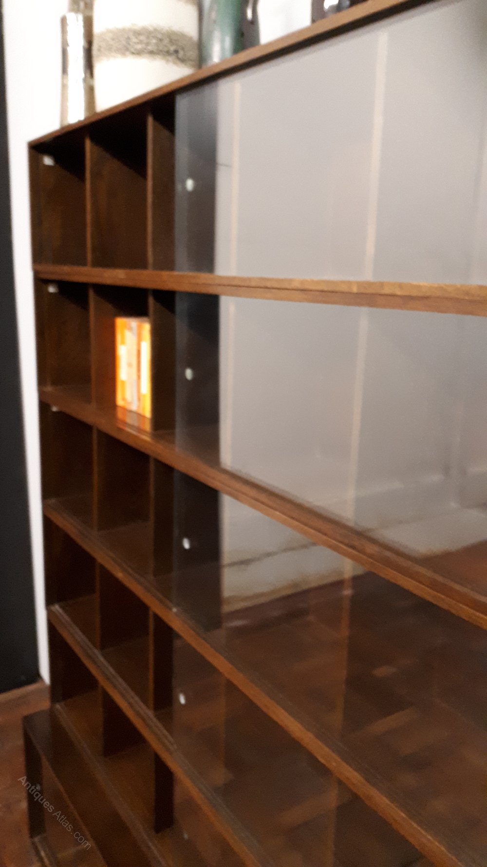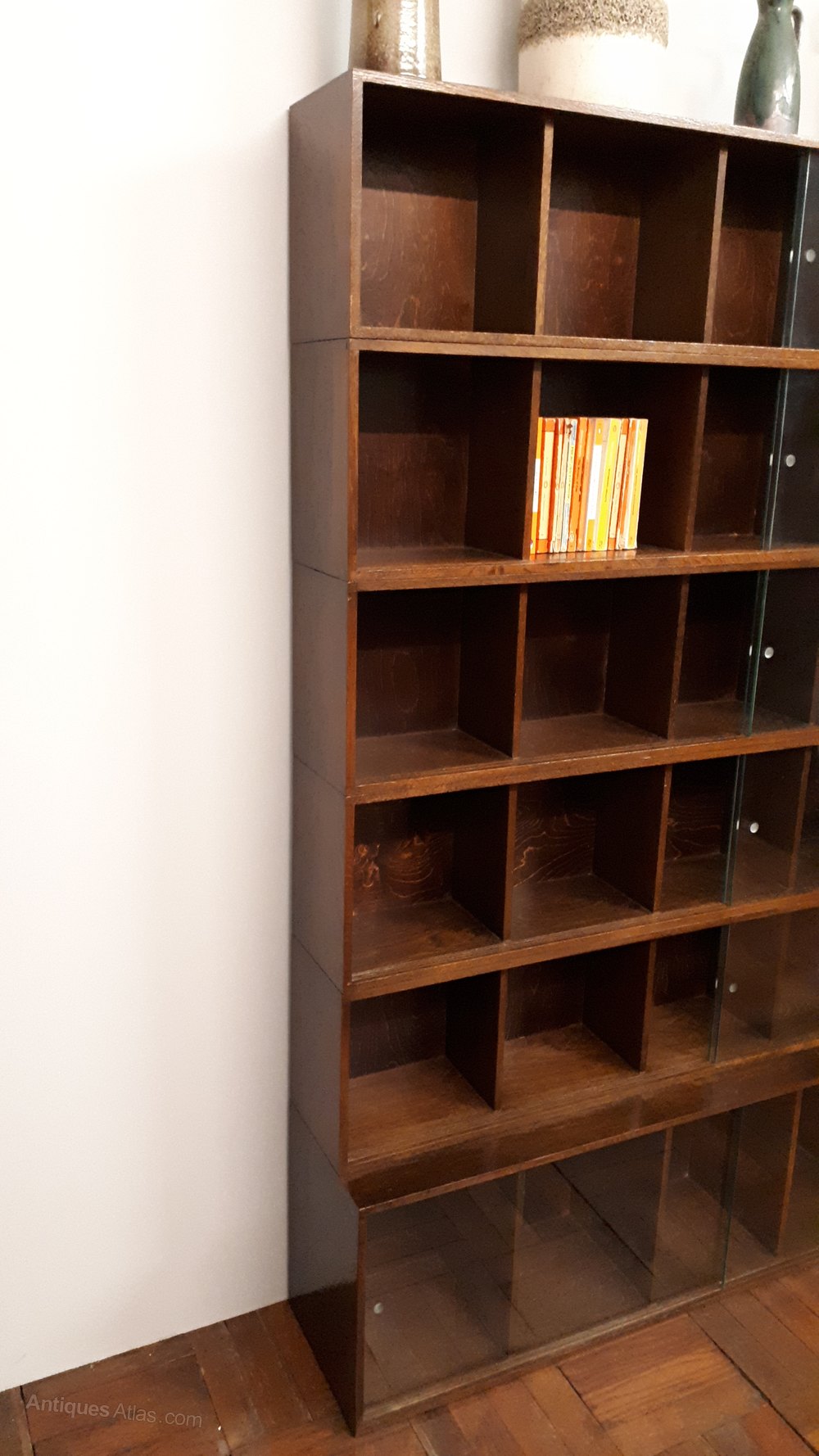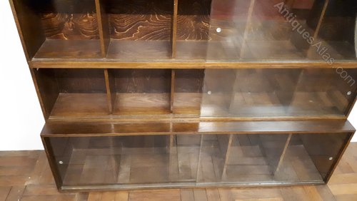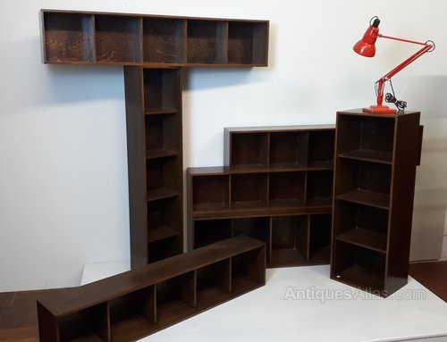 Complete set of six solid oak glazed units by Unix retailed through Phoenix Gallery, London. All in good condition with removable glazed doors. These are versatile as can be arranged even vertically, and fixed to the wall(see image from earlier sets we've had).