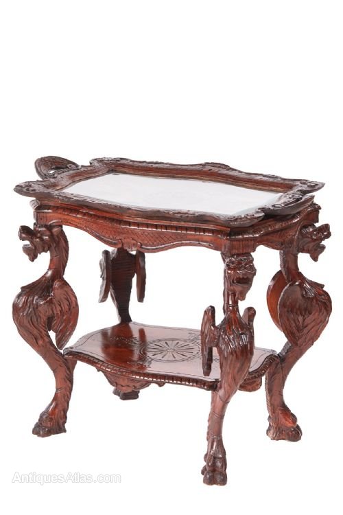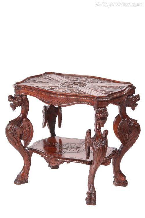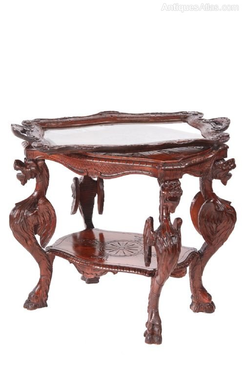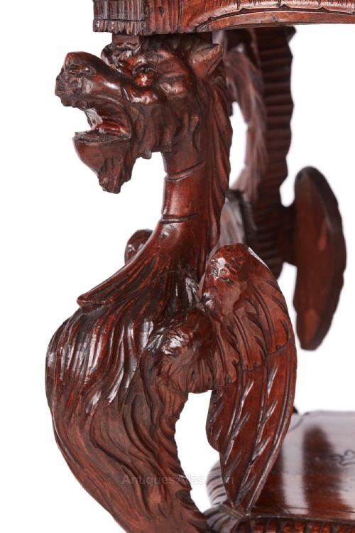 Unusual antique carved oak Italian centre table, having a serpentine carved top with lion decoration, fitted with a removable tray with a glass top,the upper tier raised on four lovely carved caryatid Dragon legs on paw feet united by a carved under tier.