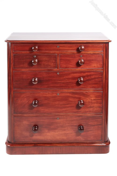 Unusual antique victorian mahogany chest of drawers,having a lovely top with a thumb moulded edge,one long drawer two short drawers and three long drawers all with original turned mahogany knobs,standing on a plinth base