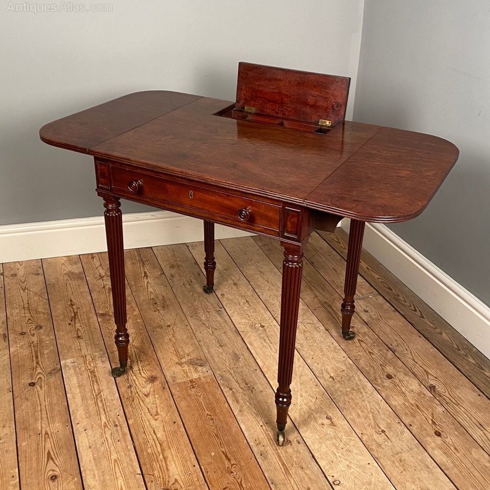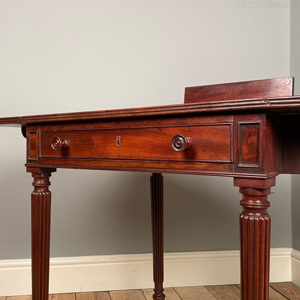 A highly unusual George IV Gillows Mahogany chamber table. Having a single drawer with dummy drawer to the back, all with the beautiful original handles. The top conceals a compartment for ink wells with pen tray This chamber table has the addition of side flaps giving a greater working surface if needed. With reeded edges and raised on slender reeded tapering legs with original castors. Lovely colour with original finish. Atb. Gillows, English, Circa 1825.