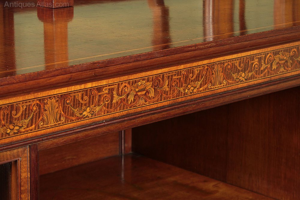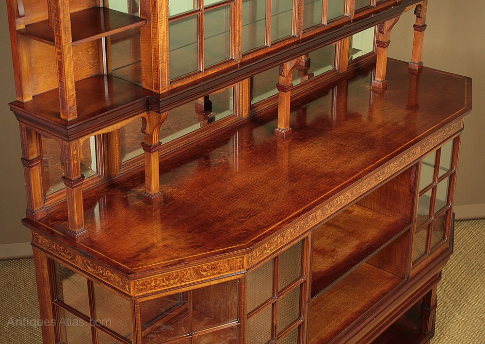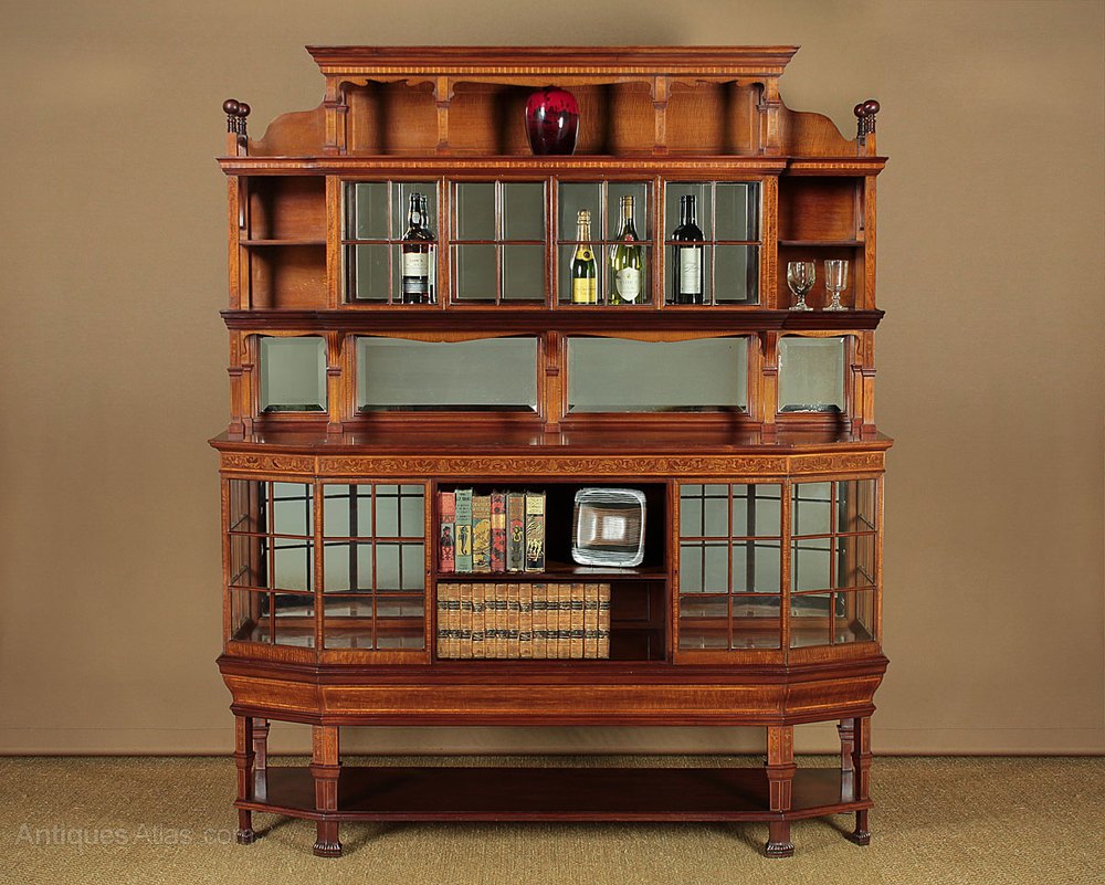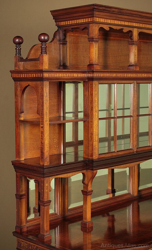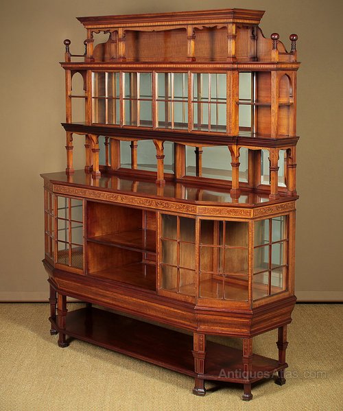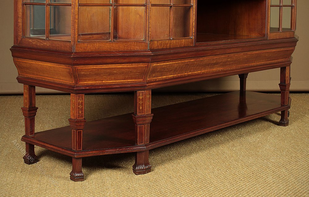 An interesting example of the hybrid ‘Reformed Gothic’ style featuring a fascinating blend of design elements. Notice the Islamic arches and pommel finials at the sides of the rack – typical of the Moorish inspired designs of Liberty from around this time. Fine inlaid marquetry work frieze around the top of the base with Classical or Rennaisance motifs. The canted corners of the base and the narrowing apron below are also unusal, inspired by the forms of Arts & Crafts design, with the potboard borrowed from vernacular antique furniture. Unusual flared and carved block feet. The further satinwood inlaid detail and stringing to the horizontal elements, columns and legs is rather more typical of that found on Edwardian furniture. Very good original colour and condition, cleaned and waxed in our workshops. Keys supplied.