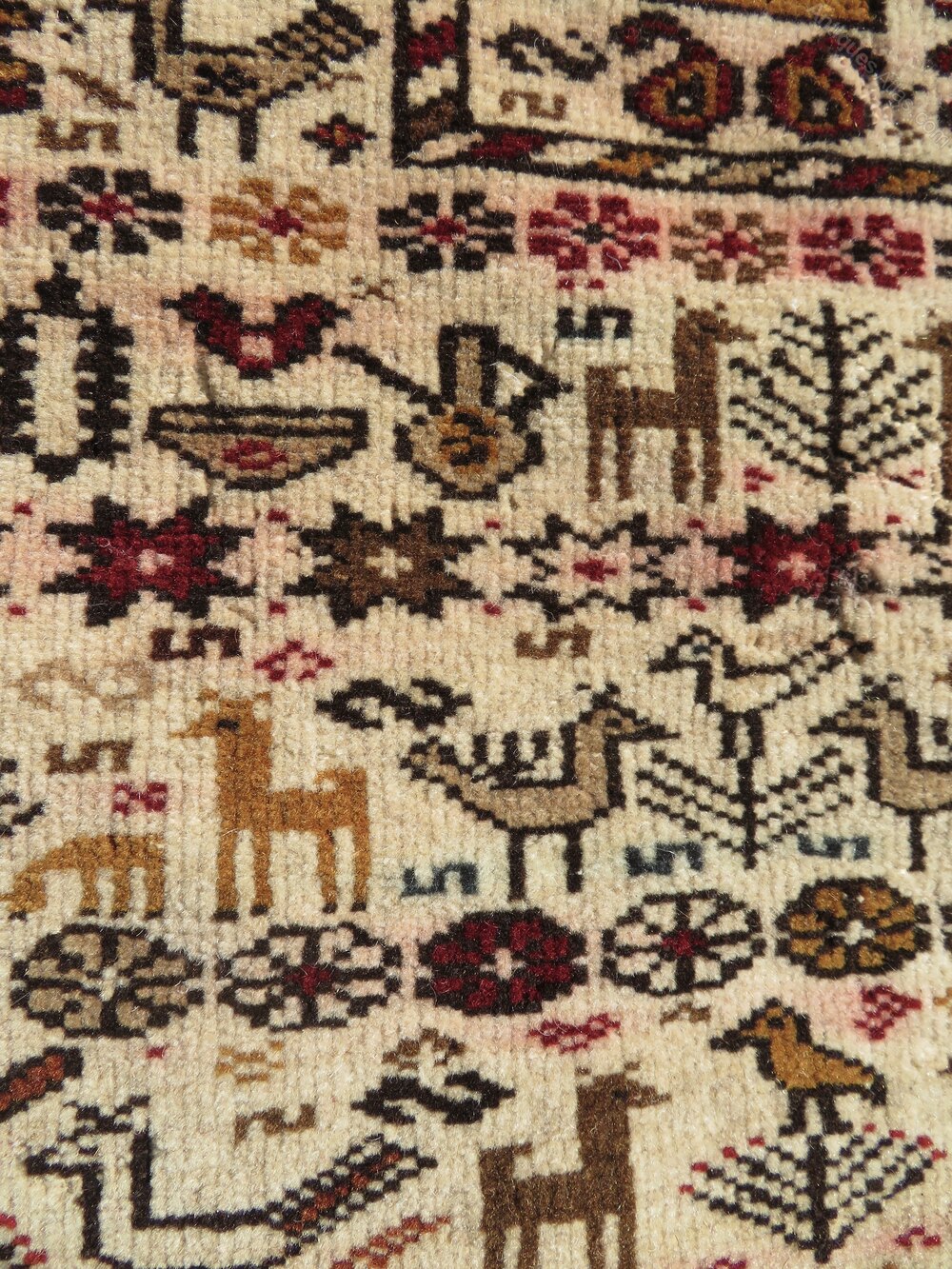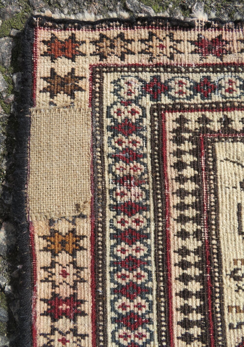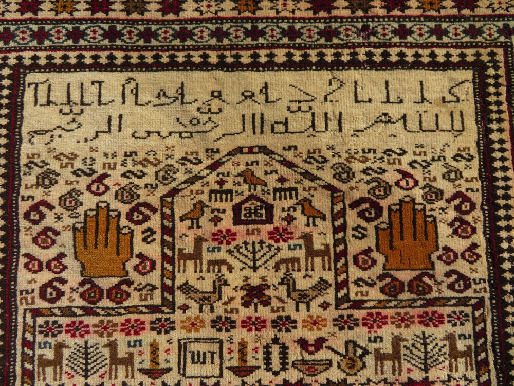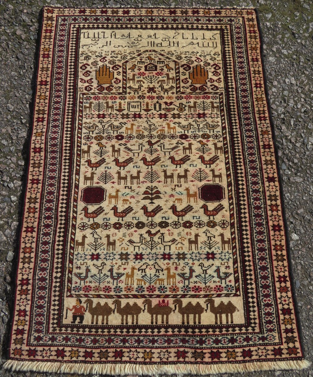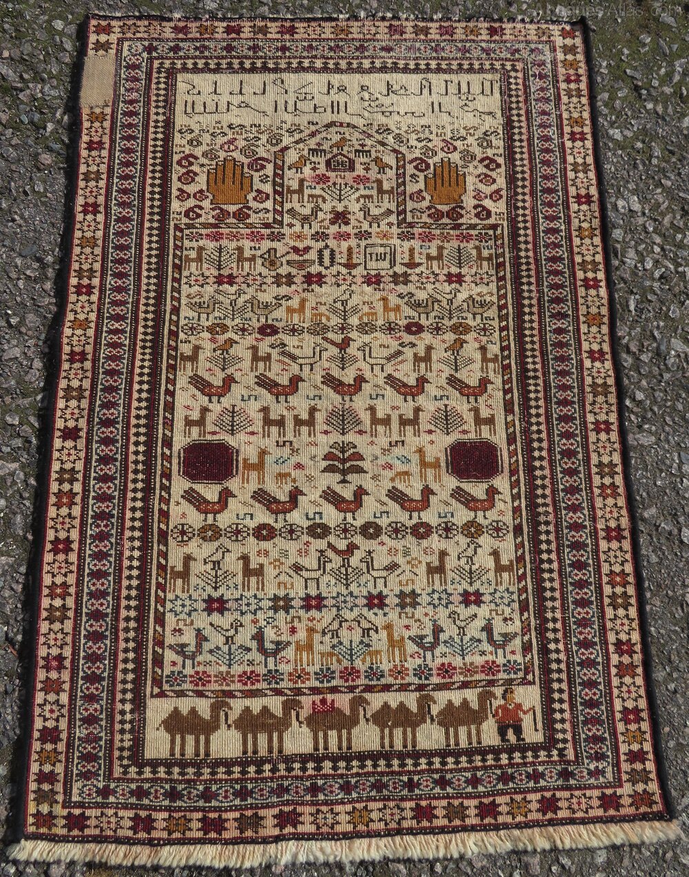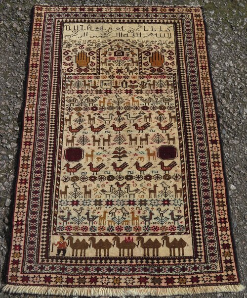 West afghanistan. Herat region. Very unusual pictorial prayer rug with the hands of fatima,inscription to top end and a plethora of animals,birds and mystical motifs. Top end lost fringes and a repair patch to reverse. 3 foot 6 inches by 2 foot 5 inches. 107cm X 74cm. All wool construction. Ideal for wall hanging or collector of these items. £195. U. K post £16. Now selling very reasonably no frills priced carpets & rugs. Fos 20. Purveyors of unusual rare distinctive quality tribal rugs & carpets,howard & sons seating,some orientalist items & decorative objects for the everyman.