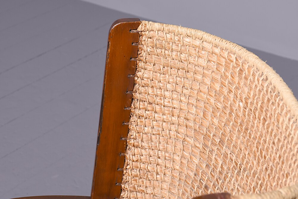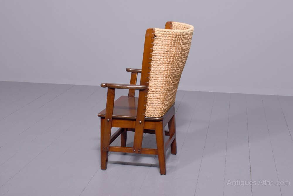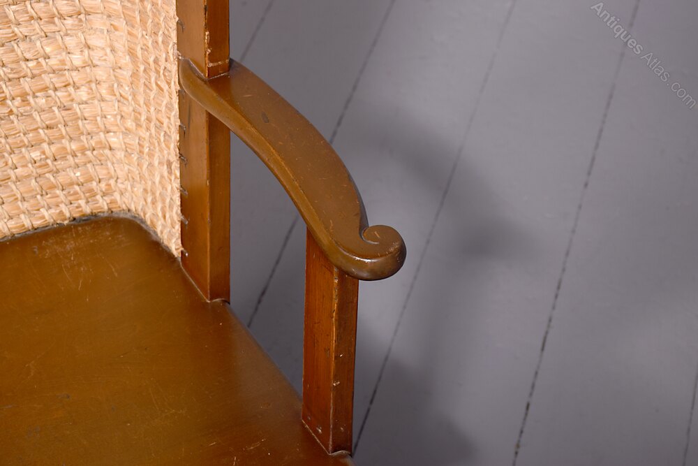 Circa 1920s, unusual stained beech Orkney chair. It has a classic straw back with top rail finished in marram grass, and drop in seat. The classic Orkney arm with a curl to the end was developed by Kirkness, and are connected to the frame by brass screws. It is on tapering front and back legs, united by stretchers.