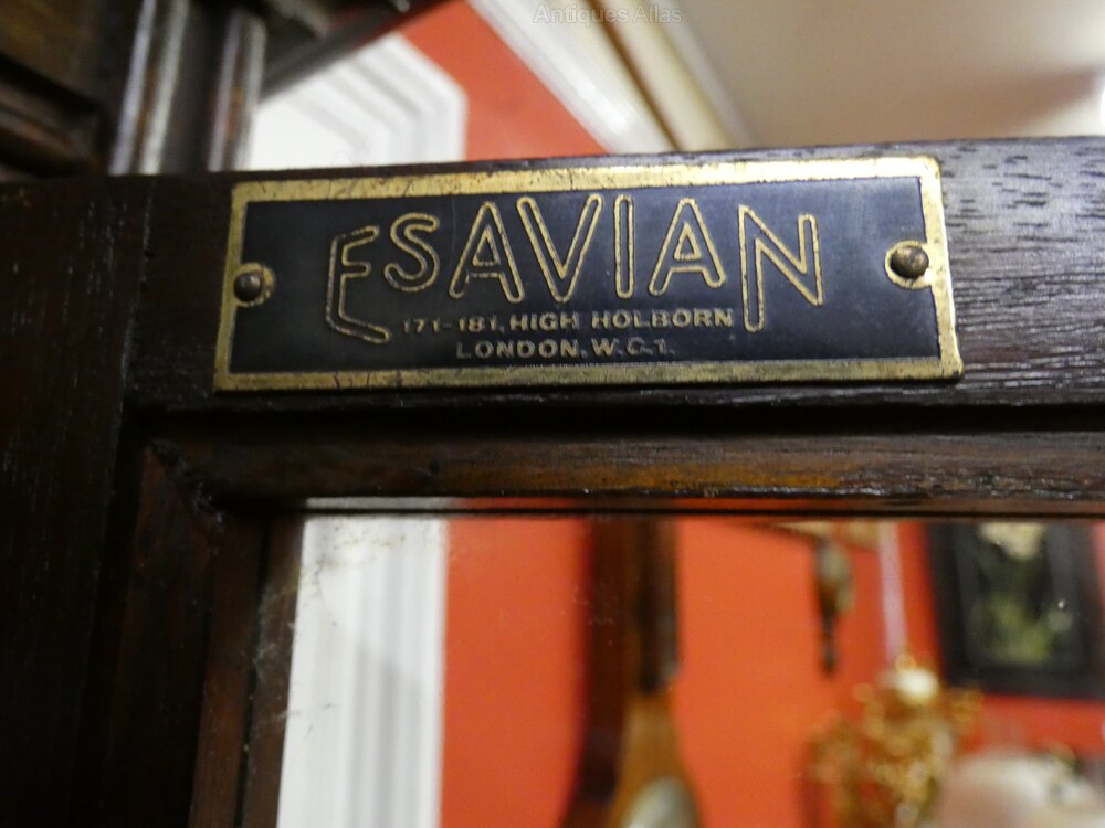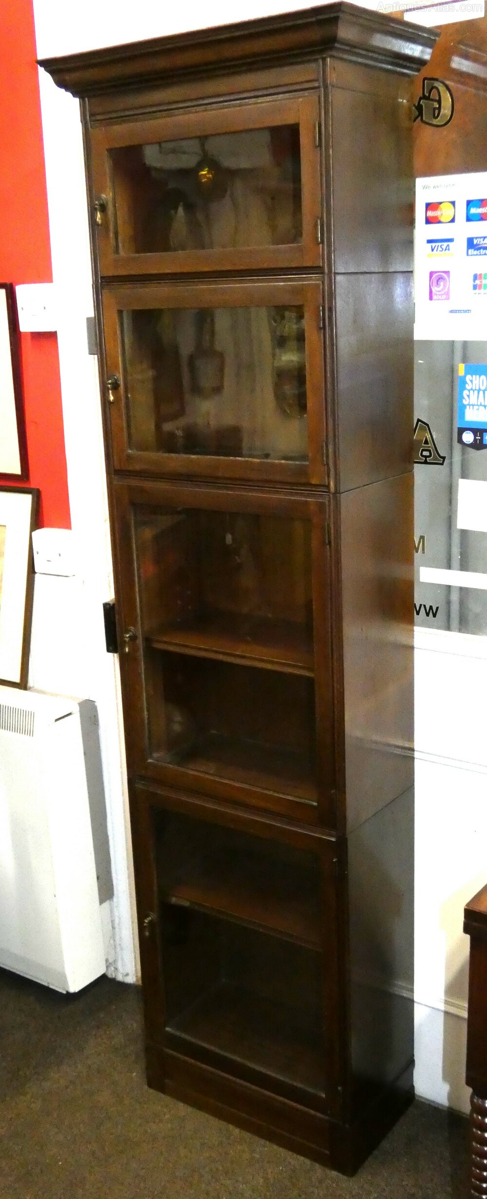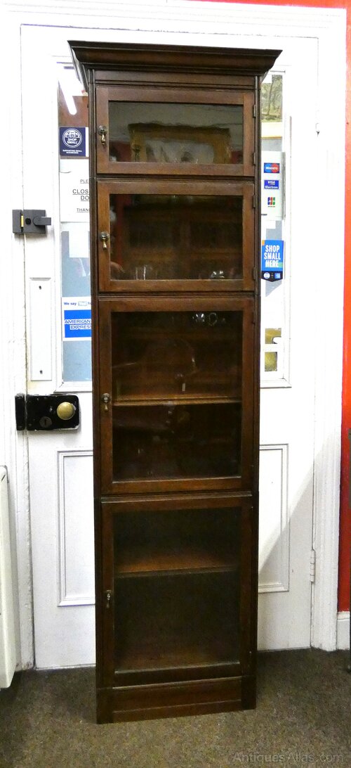 Oak four section stacking bookcase of unusually slim proportions by Esavian, High Holborn, London, the larger two lower sections with adjustable shelves.